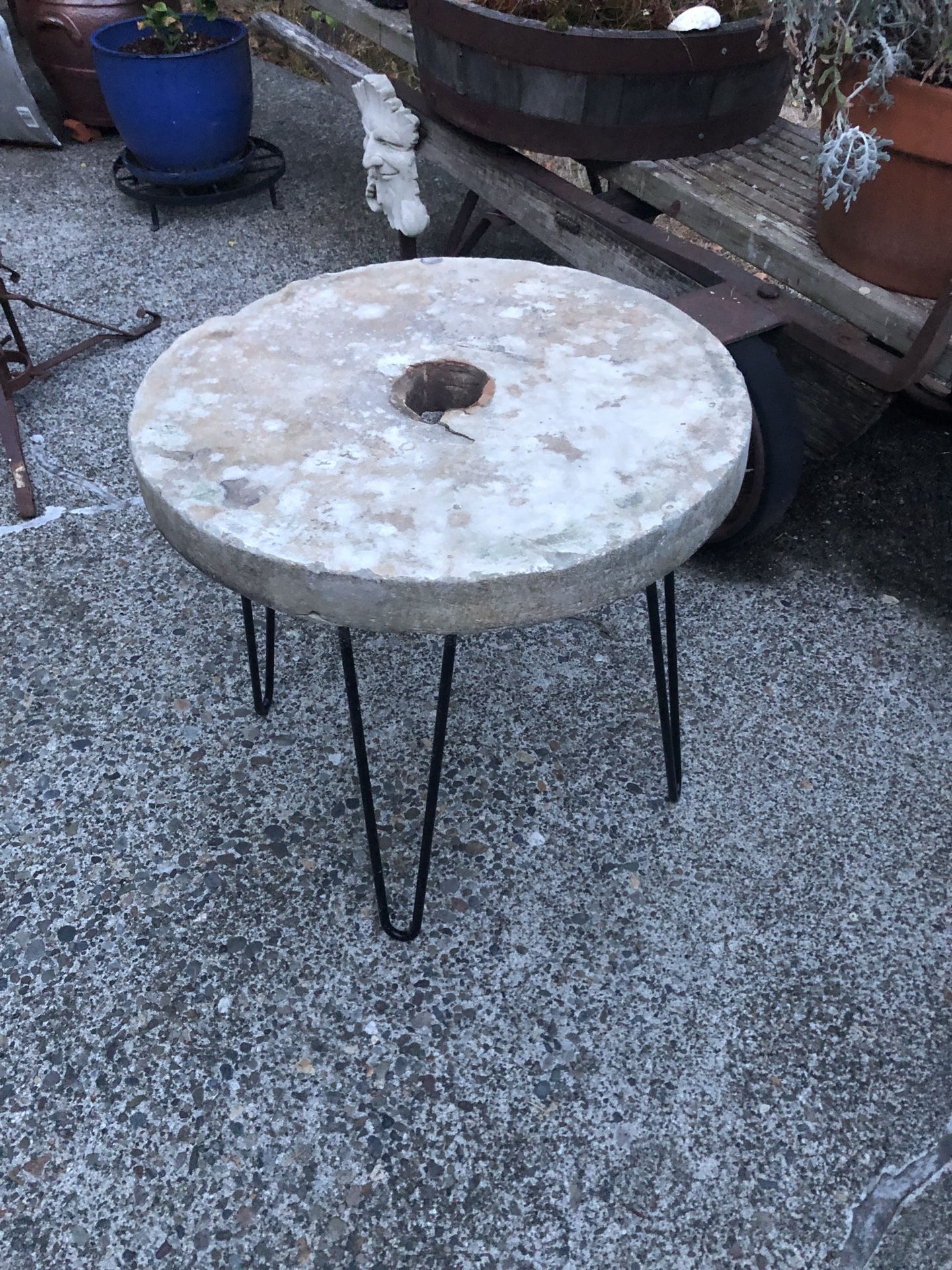 Grinding wheel with custom legs 18” high and 26” diameter Plant stand. Patio. End table Yard. Garden.