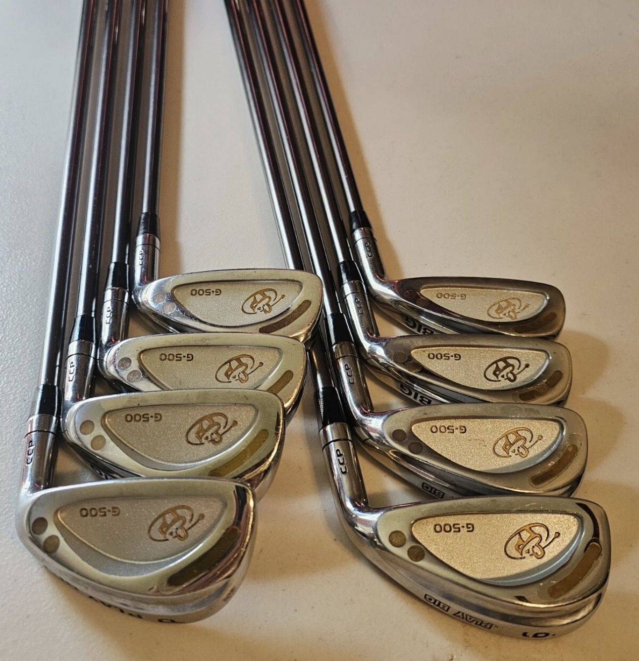 PLAY BIG G-500 CCP IRON SET 3-PW, ATS-500 GRAPHITE SHAFTS. 3, 4, 5, 6, 7, 8, 9, PW Grips and heads in great condition These are good clubs. Yes . . really!