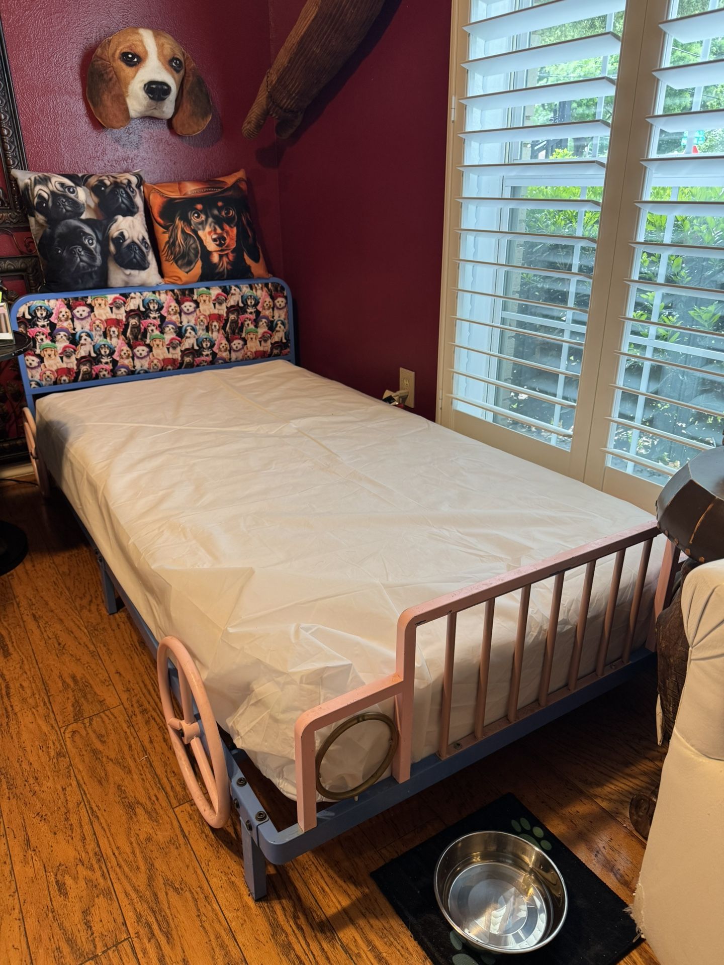 Pink and blue toddler twin bed with dogs headboard fabric. Two twin fitted sheets comes with it