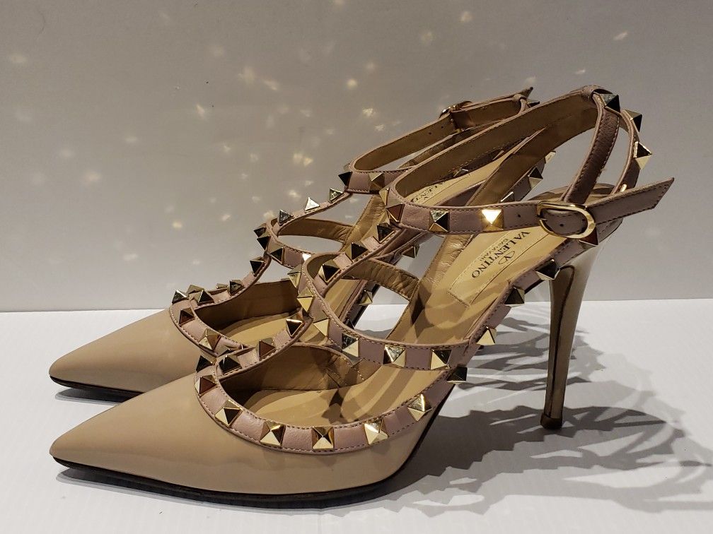 Valentino Rockstud 37.5 US Size 7 / 7.5 Beige Nude Poudre Ankle Strap Caged Pump Sandal Shoe Designer