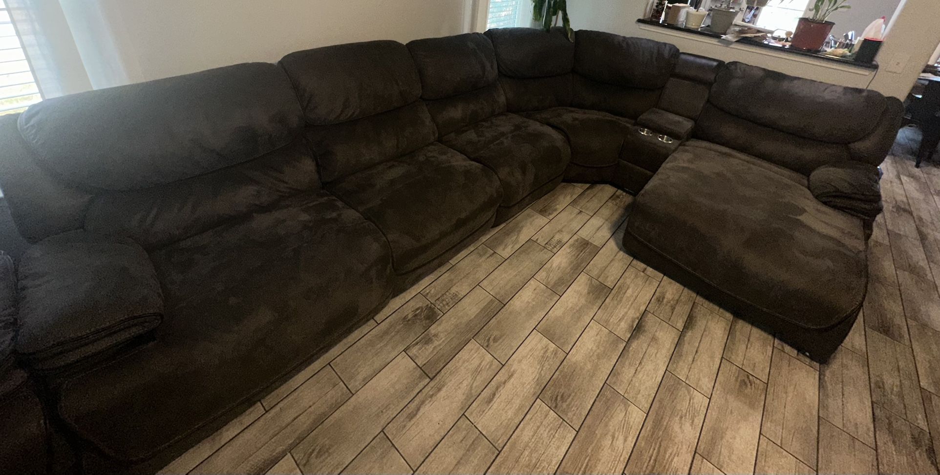 Large gray sectional with both ends with recliners one other recliner doesn’t work but could be fixed has some wear and tear but still in good condition non smoking and pet free home, need gone asap. Asking 300 obo