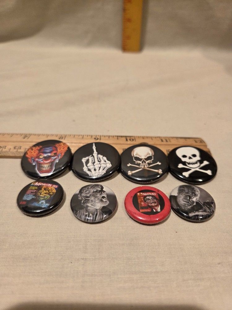 Includes 2 "Lon Chaney" - Wolfman-werewolf original button pins; 3 other monster pins, vintage 1960's; 1 vintage 1996 pirate skull and cross bones button pin; 1 skull and cross bones button pin from 2010 button pin; 1 skeleton hand button pin from 2010 and 1 scary clown 🤡 button pin!! All in very good pre-owned condition ready to add to your collection, see pics.