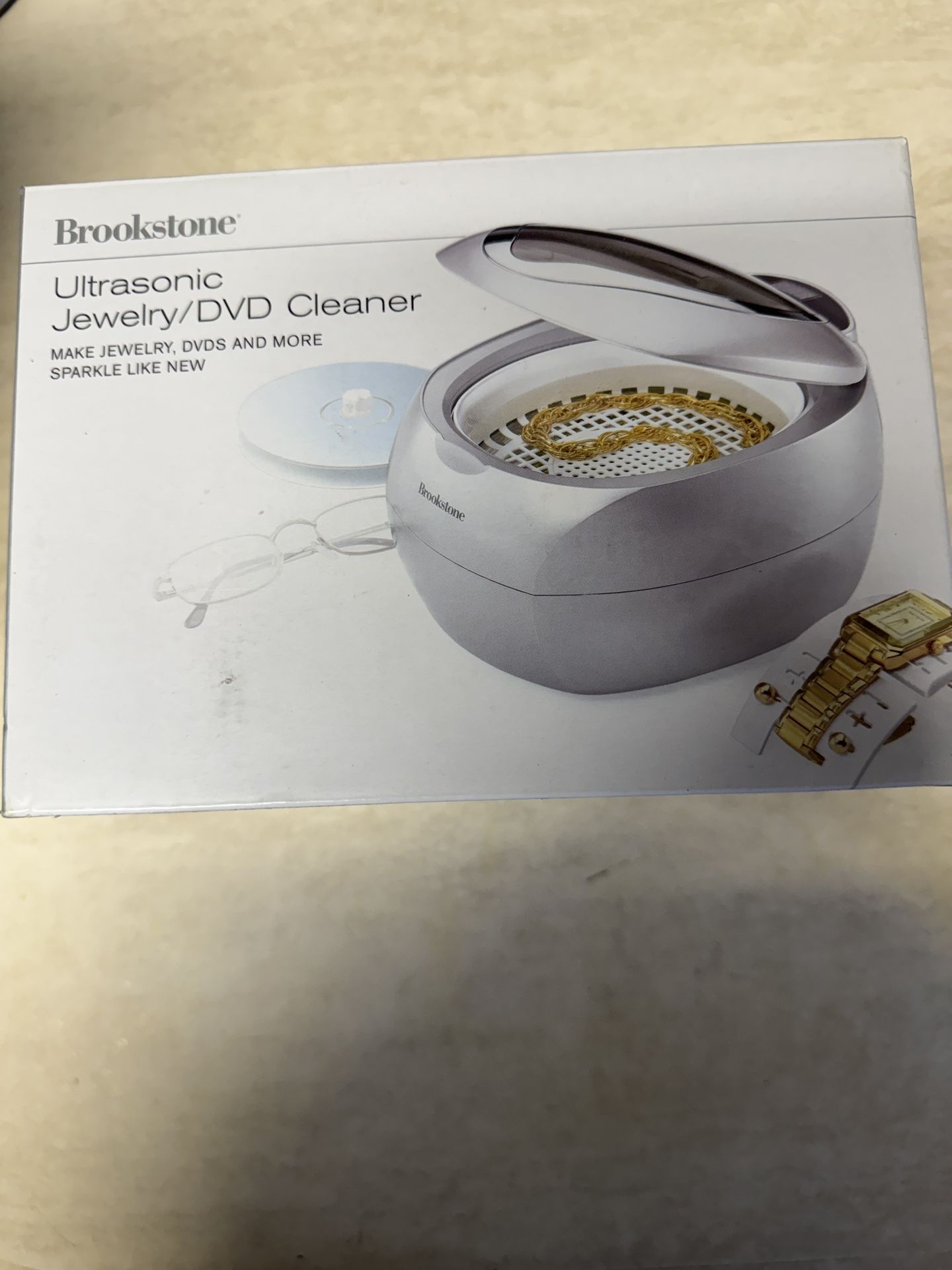 Brookestone jewelry cleaner - brand new in the box never used. It’s an ultrasonic device that uses water and sound waves (not chemicals) to deep-clean items like jewelry, eyeglasses, watches, CDs, and DVDs, featuring timed cycles and intensity settings.