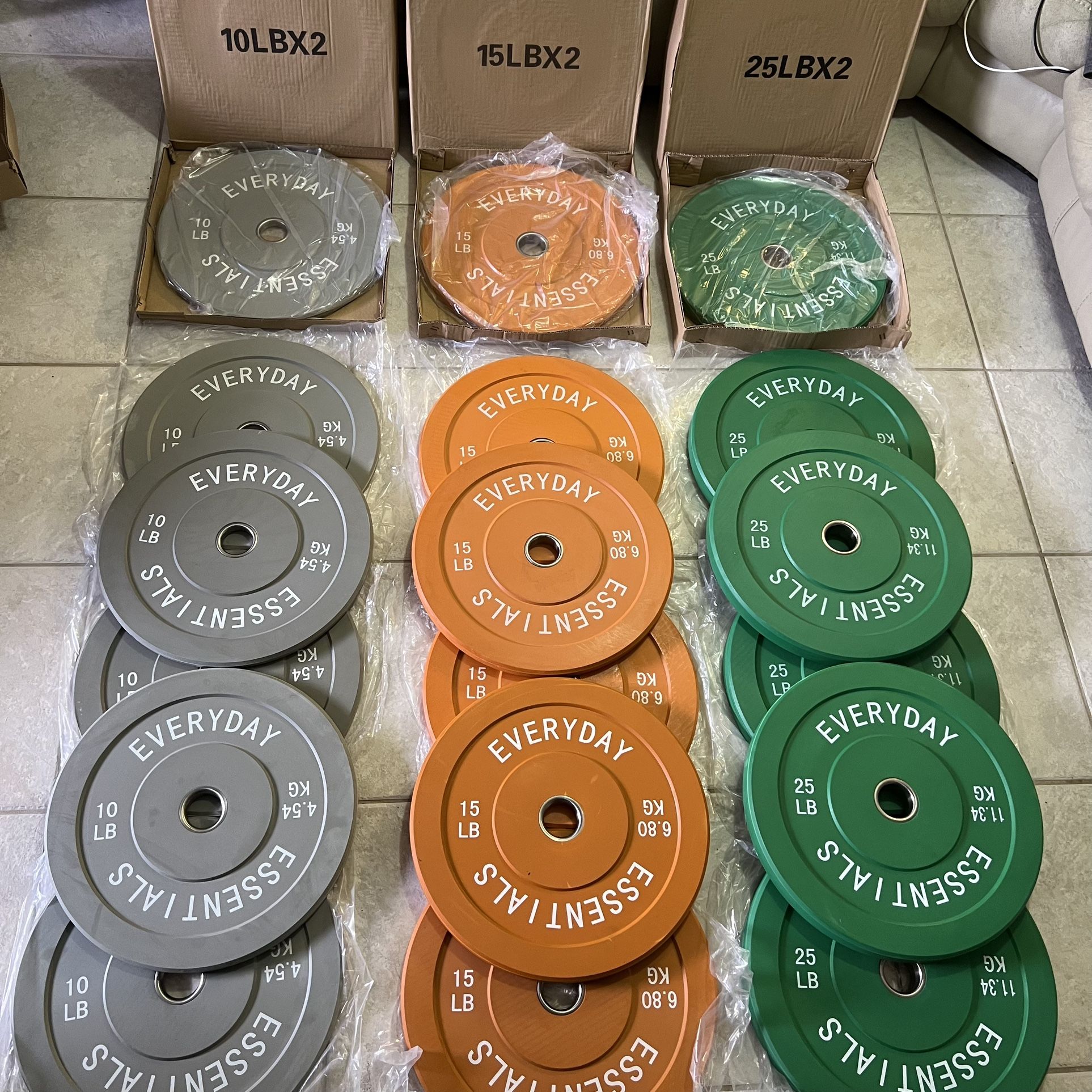 We can do Pick up, Meet up, or Delivery. 6x 10 lbs. plates 6x 15 lbs. plates 6x 25 lbs. plates - Versatile Set: CLR Bumper 100lb (3 sets) Set for versatile weightlifting options - Durable Rubber: Constructed from high-quality, dense rubber for durability - Low Bounce: Low bounce design enhances safety and stability during lifts - Precision Fit: Fits Olympic-sized bars with precision-machined center hole to prevent wobbling - Calibrated Weights: Includes precisely calibrated pairs of 10 lbs, 15 lbs, and 25 lbs bumper plates - Minimal Maintenance: Durable rubber construction requires minimal maintenance and is easy to clean - Space-Efficient: Compact design allows for easy storage and organization in your gym space