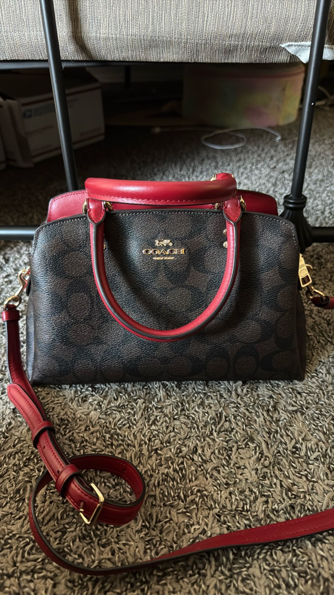 Coach Mini Darcie Carryall in dark brown with red accents. It's a cute little bag, perfect for everyday use or a night out.the colors really pop. Let me know if you want more pics or details.