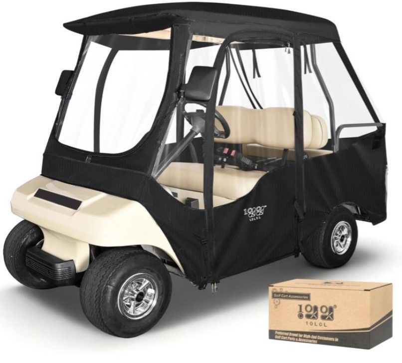 Only $84.49-(35% off!) List Price $129.99 Brand New In a Unopened Box See Images for more Details: Upgrade your four-seater golf cart with this premium 10L0L black 4-passenger enclosure designed exclusively for the Club Car DS (2+2) configuration. Crafted with heavy-duty 420D Oxford polyester (or 600D in upgraded versions) and full 4-sided clear PVC windows, this enclosure shields you from rain, wind, snow and other harsh elements while preserving visibility. The design features zip-open side doors and rear window panels (zip both inside and out) that roll up and secure via hook & loop “magic tape” fasteners for ventilation. Patented mirror-extension zipper allows the side mirrors to protrude when installed, and the transparent design around the tail lights maintains street-legal visibility. Bottom hooks and straps securely fasten the cover to the cart, keeping it in place even in high-wind conditions. Installation is tool-free and takes just minutes — simply drape over the roof of your DS, roll down the sides, secure the hooks, and you’re ready. Note: This model is engineered specifically for standard-roof Club Car DS 4-passenger models (not extended-roof variants) and when fully enclosed the rear seats may have limited space. Includes duffel storage bag. Ideal for golf course use, resort/club service fleets, seasonal storage, and weather-prone environments. Bring comfort and protection to your ride. Shipping Size :14x10x7 @ 6lbs