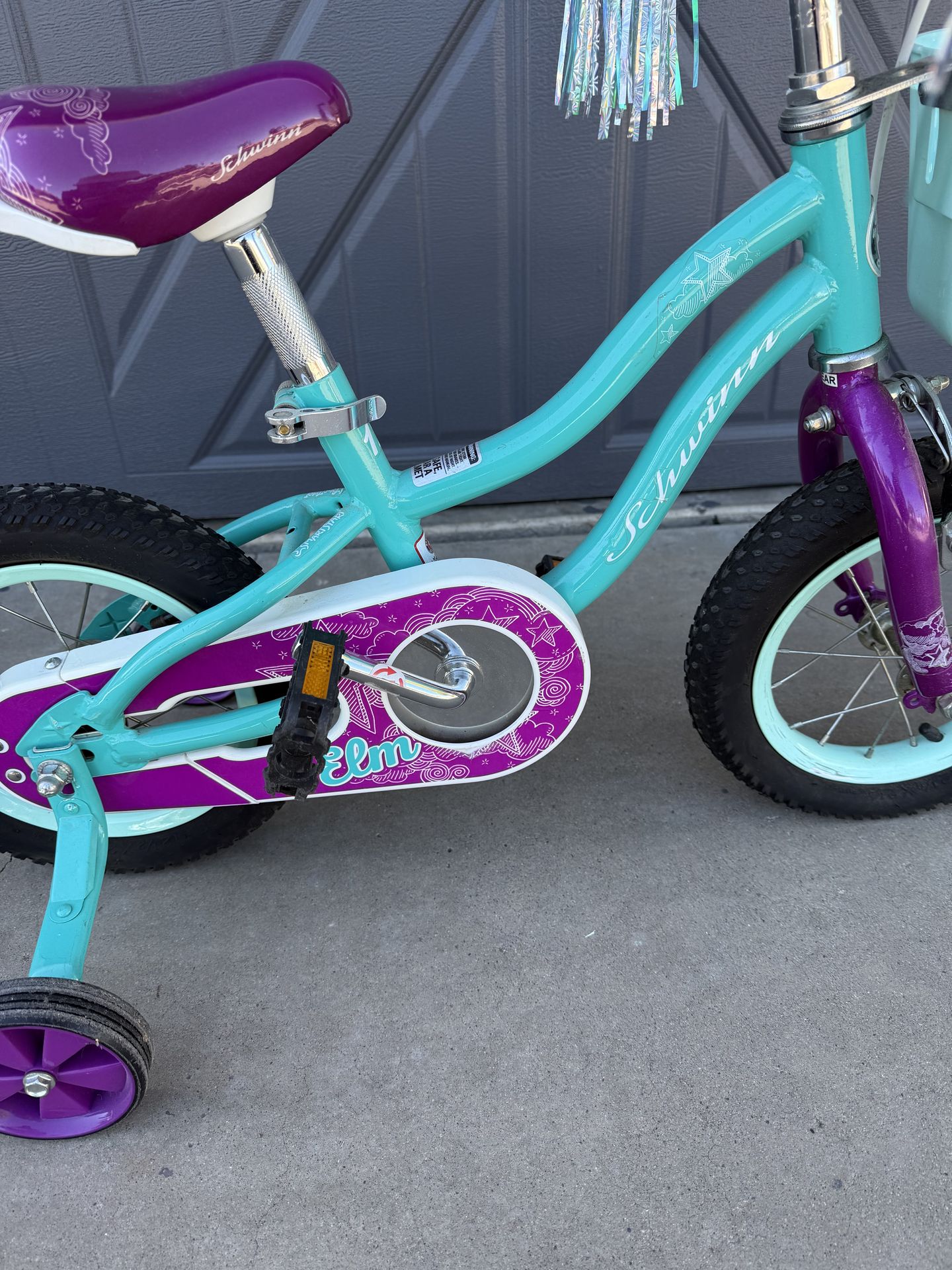 12” wheels, 19 1/2” To Seat, training wheels, Streamers and Bell. Great Condition.