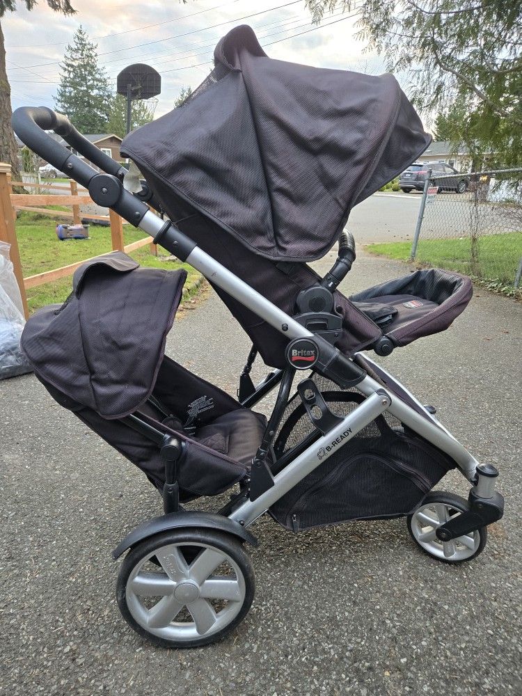 Good condition Britax double stroller, comes with a bag of accessories, sun shade, rain cover, drink and tray. It could use a wipe down from being in garage. Small tear in bottom sun shade but not all the way through so can not see it when pulled down: Last photo