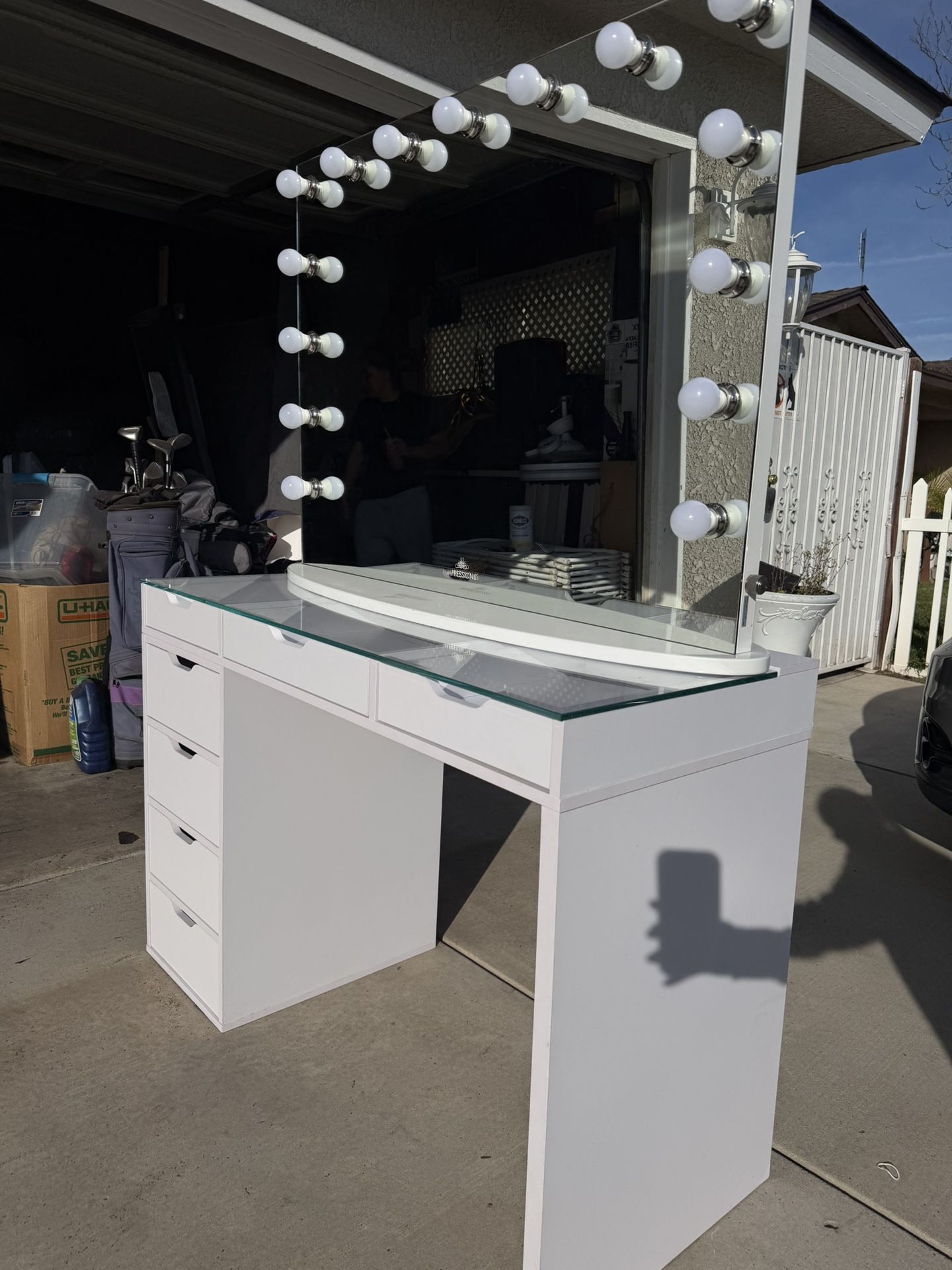 Great condition full size dimming light/bluetooth mirror + full size white vanity Open to check out in person. I work with pricing as well.