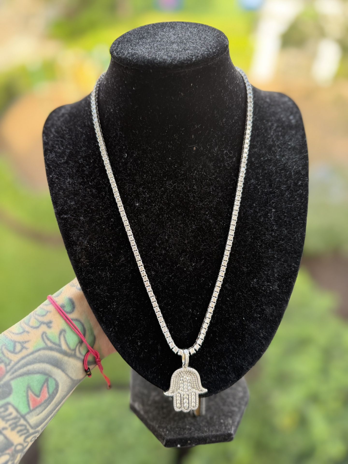 22 inch long 3mm wide silver tennis chain With hamsa hand pendant fully iced also silver with Moissanite diamonds . Beautiful and shinny ! 🤩