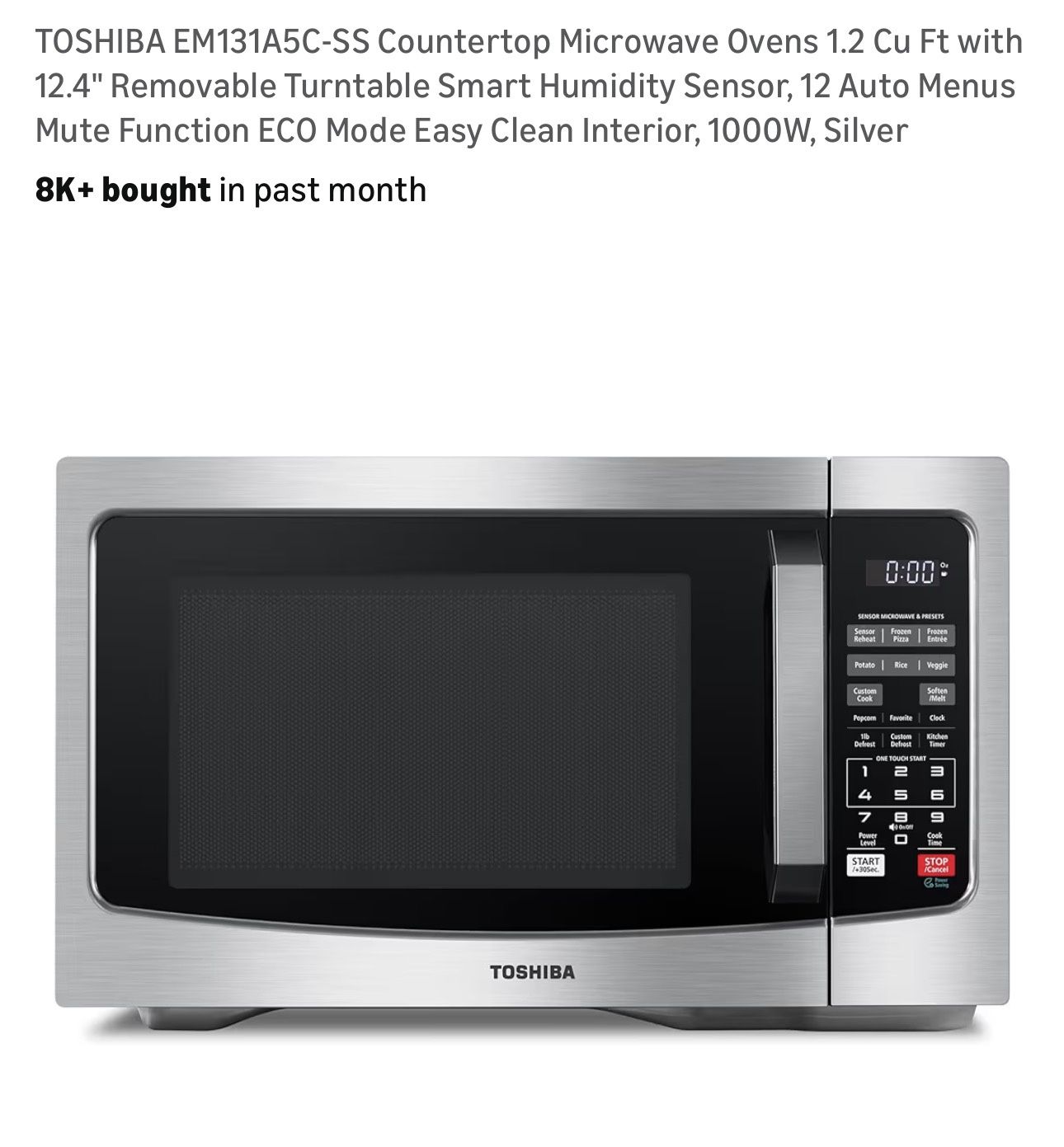 TOSHIBA EM131A5C-SS Countertop Microwave Ovens 1.2 Cu Ft with 12.4" Removable Turntable Smart Humidity Sensor, 12 Auto Menus Mute Function ECO Mode Easy Clean Interior, 1000W, Silver