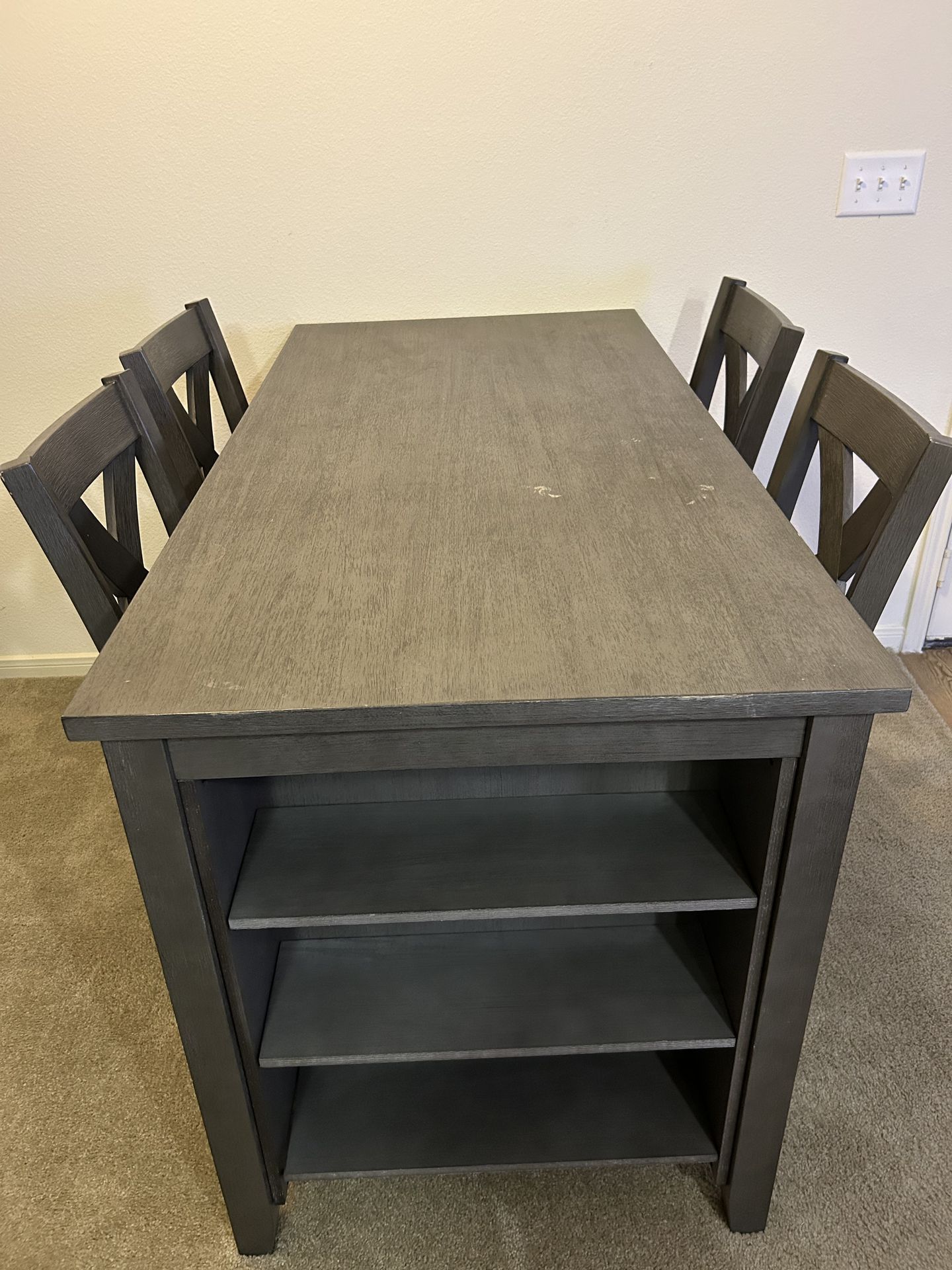 Gray dining table with four matching chairs and built-in shelves. Slight discoloration on top, and minimal scratches on two chairs. Table brace was taped in place by movers to stabilize. $200 OBO, only "catch" is we're on the third floor and you must pick it up yourself.
