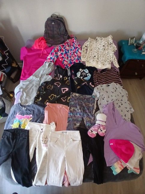 Girls clothes various sizes and brands like Under Armour, Old Navy, Gap, Adidas.1 jacket, 1 scarf and hat. 2 pair jeans, 1joggers (still has tags)3 leggings, 5 hoddies, 4 long sleeves and a backpack. ALL for $20