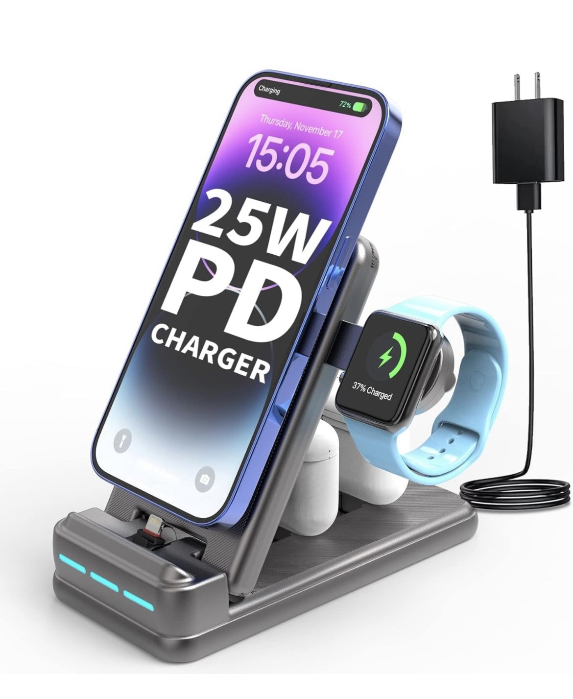 4 in 1 Foldable Charger Stand for iPhone Series 14 Pro/13/12/11/X, Apple Watch, Dual Charging Connector for AirPods and Type C Earbuds