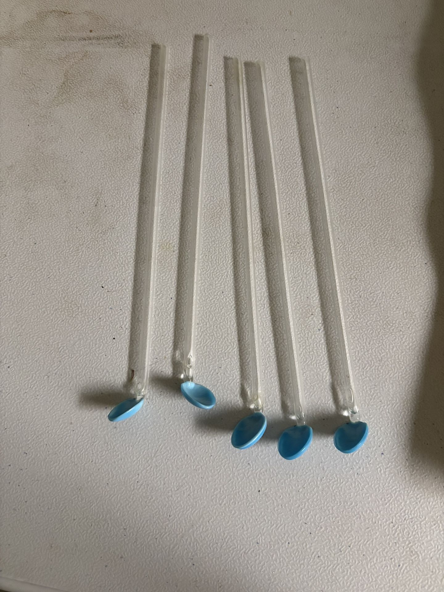 I have a set of 5 vintage glass iced tea spoons/swizzle sticks. The spoon part is a light blue while the handle is clear class. My mom got these from one of her great aunts so possibly from 1960’s or even older.