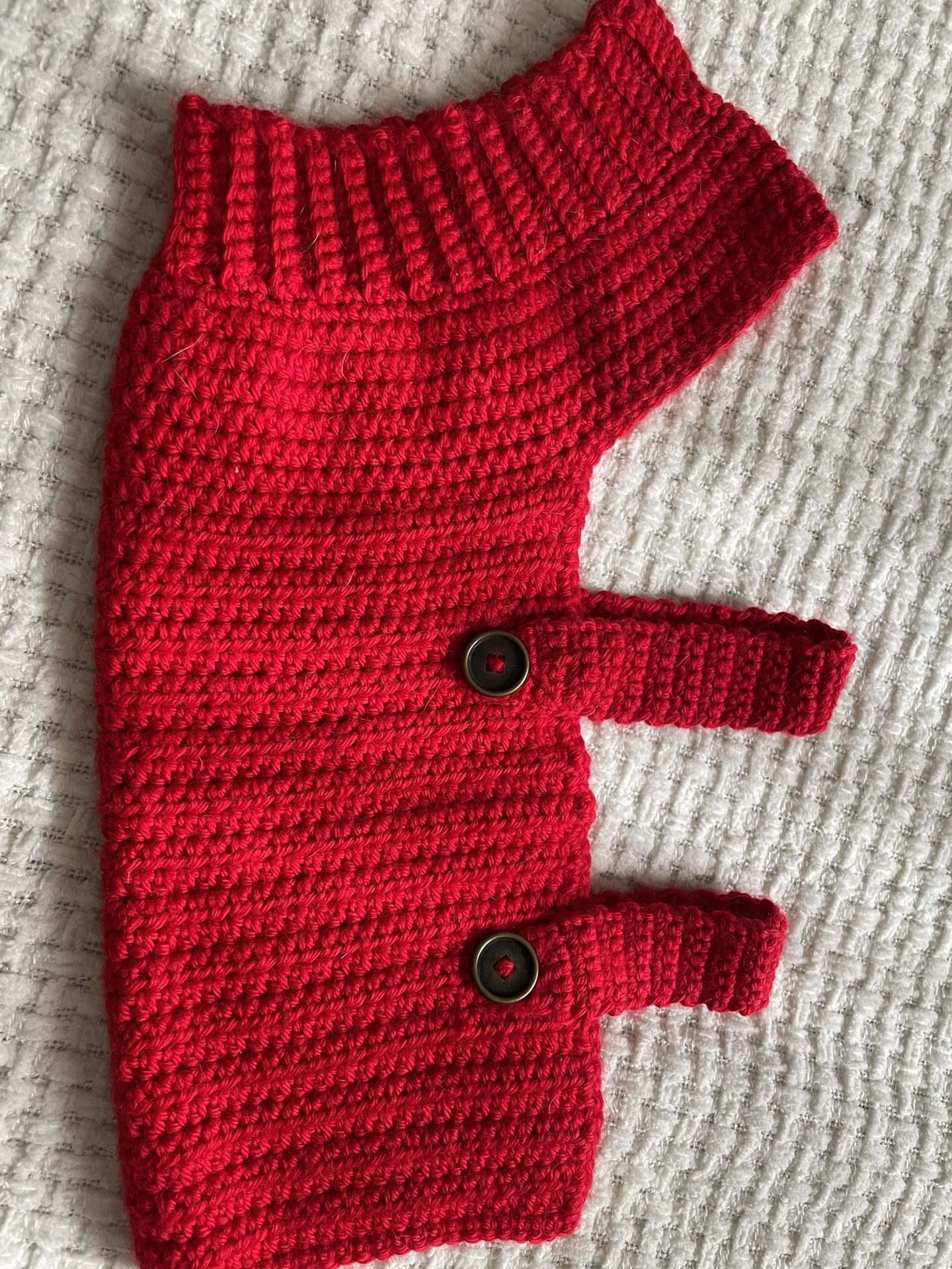 Red dog sweater with button details, red & black 14” collar with d-Ring to attach tags and 4 toys