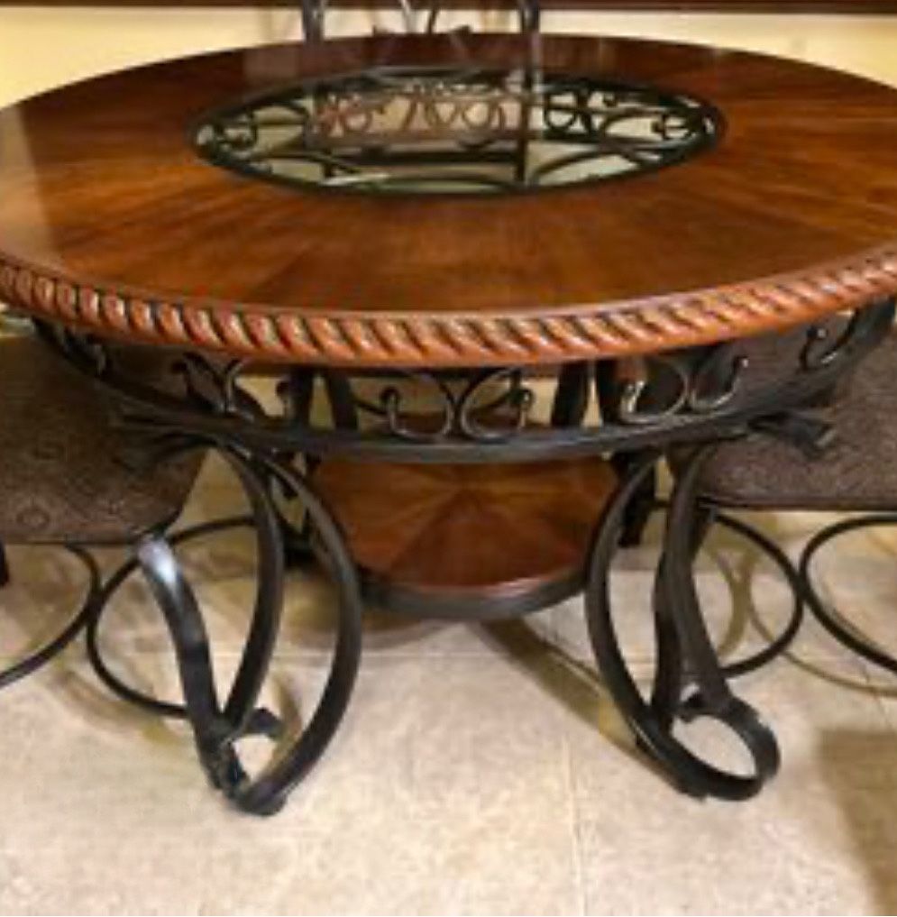 Great condition, signs of use few scratches and blemish. Beautiful table. Table base made with tubular metal in dark bronze color powder coat finish Table top with rope twist edge profile is made from select veneers in a brown cherry finish Clear tempered glass insert in table top has metal details below The table has small shelf in the base Approx 84 lb W-44" D-44" H-30.8" Pickup near STAFFORD TRACTOR SUPPLY 36 Algrace BLVD Stafford Stafford, VA 22556. No delivery!