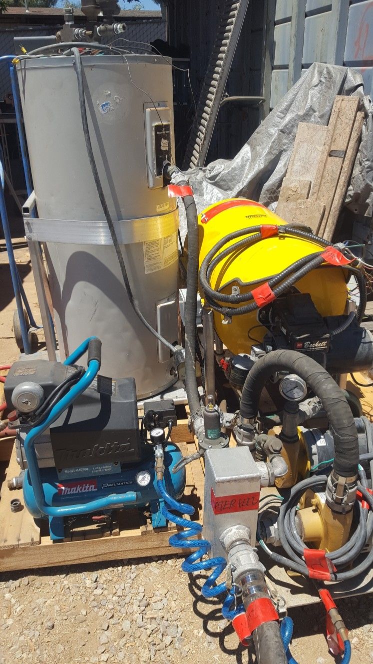 Complete portable high pressure hot water discharge system with -Beckett diesel burner, -Two Baldor motors, -Monarch Industries pumps, -Makita air compressor, -Bradford White hydrojet hot water heater complete with 125 psi setting, hoses, and some ducting. -Two 55 gallon drums for water reservoir = 110 gallons total This is a commercial / professional-grade system similar to the BIG Hotsy pressure washers but electric powered. A perfect addition to your commercial pressure washing setup. Open to trades for metal working equipment - welders, feeders, bandsaw, ironworker, tools, etc with cash up or down!