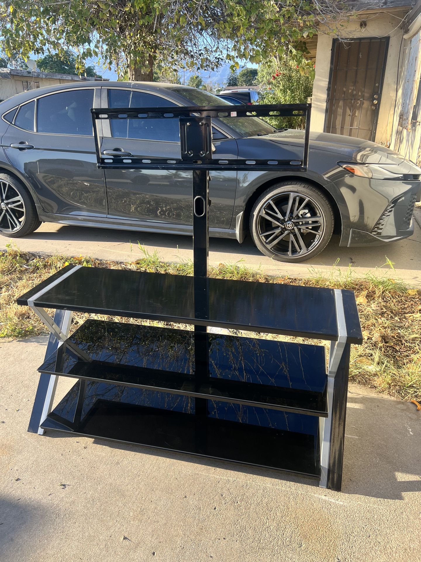 Sleek black glass TV stand. Has 3 shelves for media stuff and a built-in TV mount. Modern design with silver accents. size 50 inch wide 15 inch deep 23 inch tall tv mount 27 inch tall Asking 20 for it Pickup in Fontana ca I can provide delivery for extra cash First come first serve