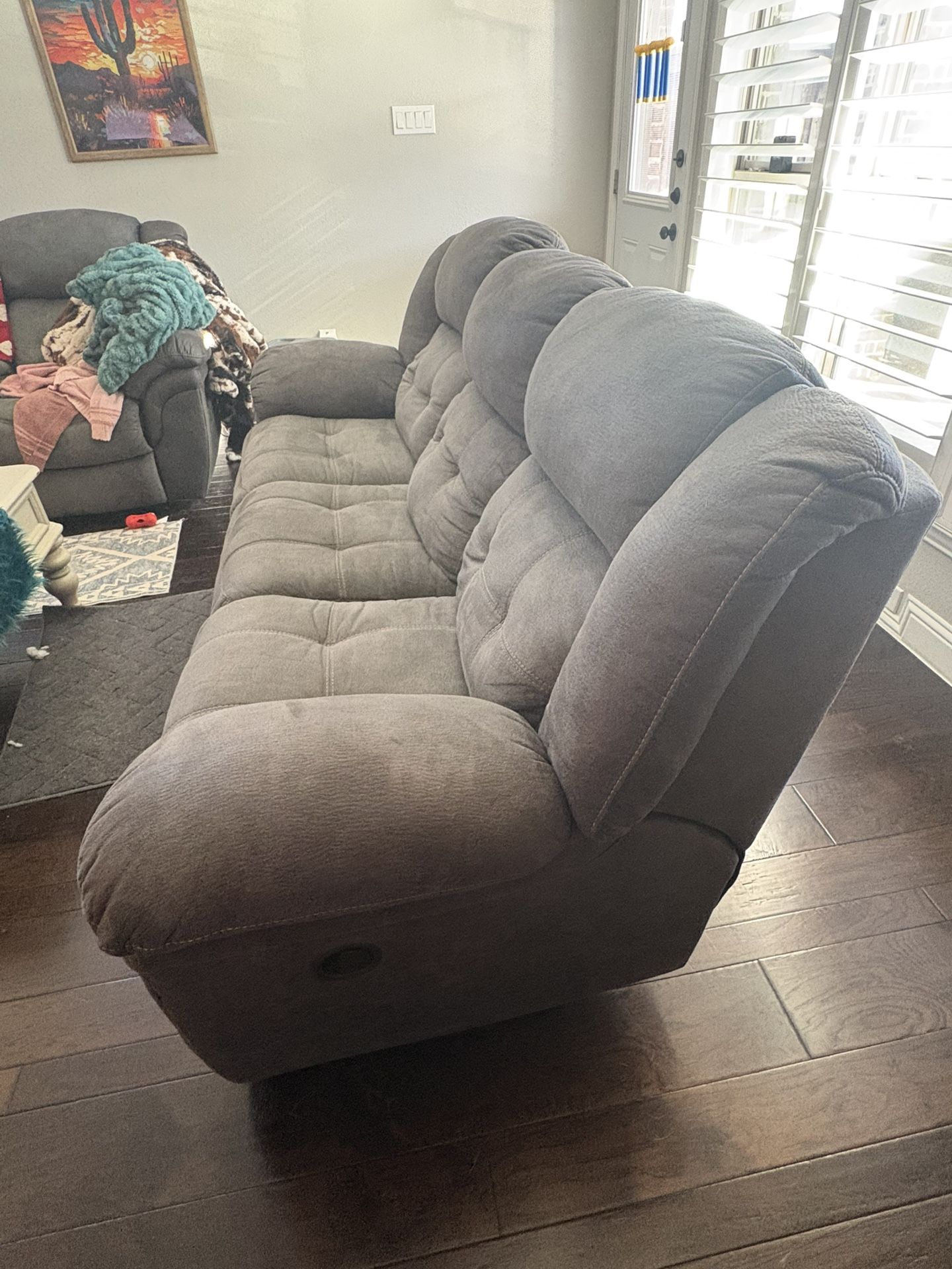 Gray sofa and loveseat with storage and cup holders. All end seats are reclining.