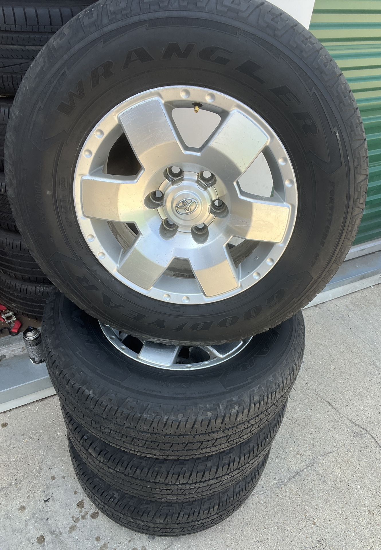 Selling Nice Set of: 17” Toyota FJ Cruiser Tacoma 4Runner Sport Factory OEM Wheels Rims Tires 17 inch Wheels are in good condition. Tire Size/ Brand: 265/70/17 265/70r17 Goodyear All Season Tires. Tires have approx. 80% tread. Joe