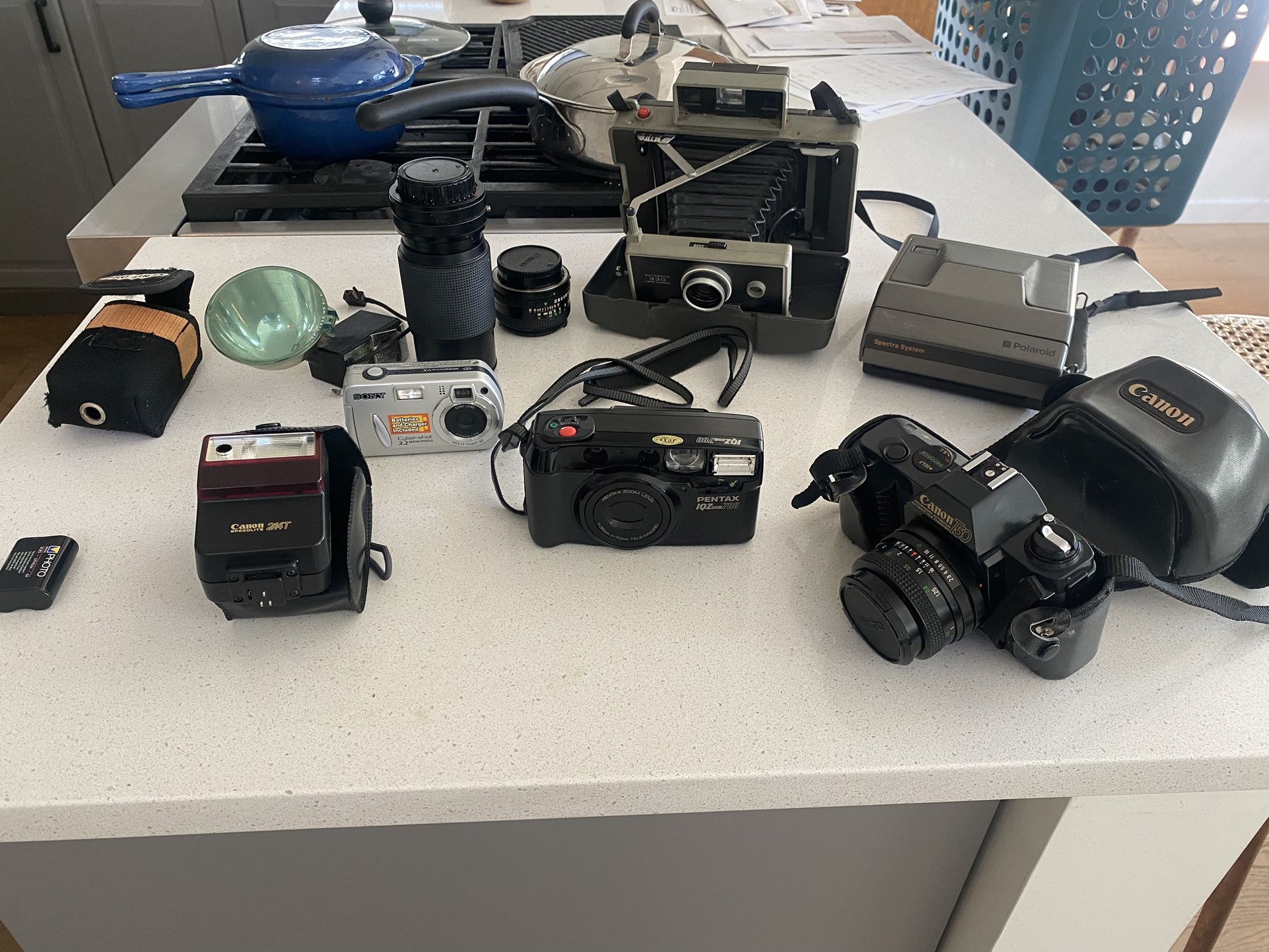 $220 for everything. Must take all. Includes: Polaroid 330 Land Camera Polaroid Spectra System Canon T50 Pentax IQZoom 700 Sony Cyber Shot 3.2 Vivitar 50mm lens Canon 50mm lens Canon 244T Flash Also included - camera tripod stand. Various carrying bags manuals papers etc $220 for everything.