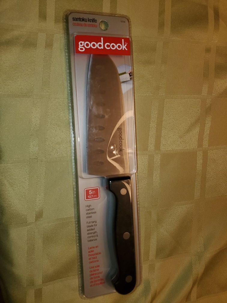 Brand new,, never opened package Goodcook Knife, Fine Edge Santoku 5" Fine edge, full tang stainless steel blade and bakelite handle with stainless steel rivets. Knife, fine edge santoku 5"