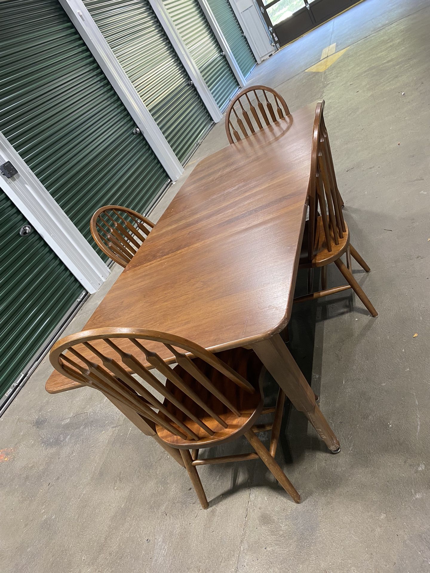 Please see picture for condition and size references. There are some west and tear on the table and it is pictured. Sold as is and would deliver for a fee. This vintage dining room table comes with three extension leaflets and four chairs, making it perfect for hosting dinner parties or gatherings. The set includes leaflets, chairs, table covers, and a dining table, providing ample seating and space for your guests. The table has a classic design that will complement any home decor. It is made of high-quality materials that ensure durability and longevity. The set is perfect for those who love to entertain guests in style.