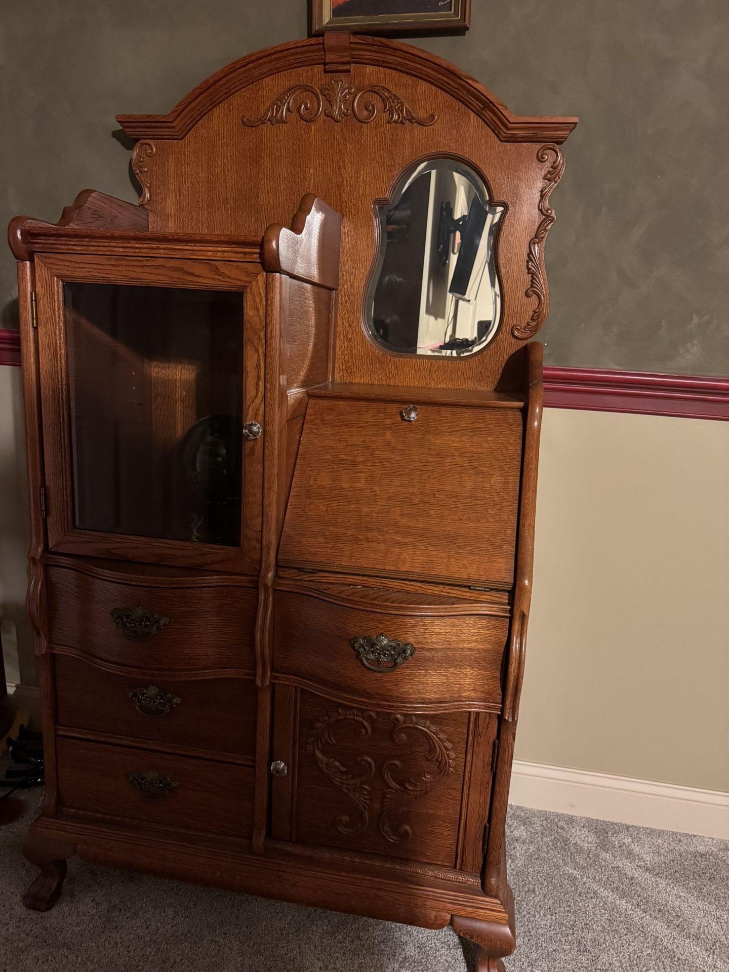 Looks beautiful, very heavy, built to last. Collectible. Discontinued late 90's. Has four drawers, two with serpentine front. Ornate antique brass pulls on the drawers. Clear faceted knob on the beveled glass door. Opens to a glass shelf. Has a large drop down door with a clear faceted knob and a keyhole shaped mirror. Lower door has a clear faceted knob and opens for even more storage. 37"W x 19"D x 68"H. Excellent condition. Asking $850... pick up only
