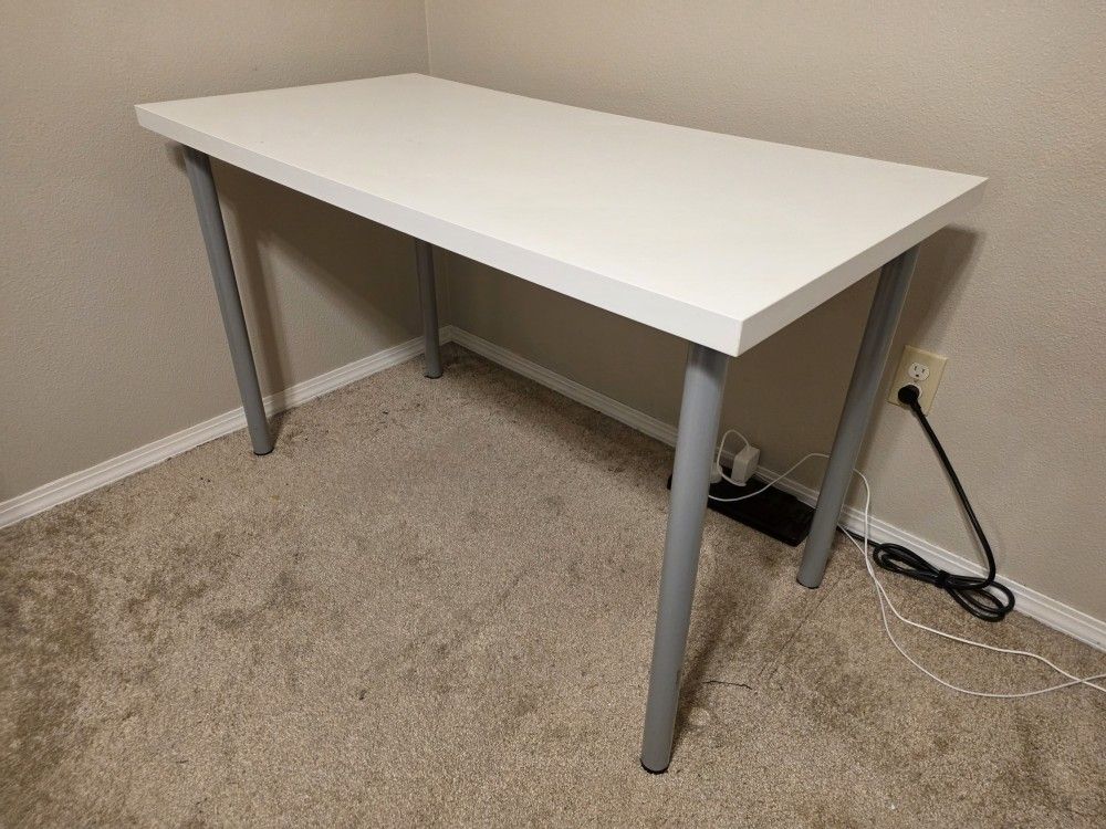 Nice home office desk or craft table in white with gray detachable legs. Dimensions are about 48in X 24in and stands at about 30in. Small scratch on the surface but overall very clean.