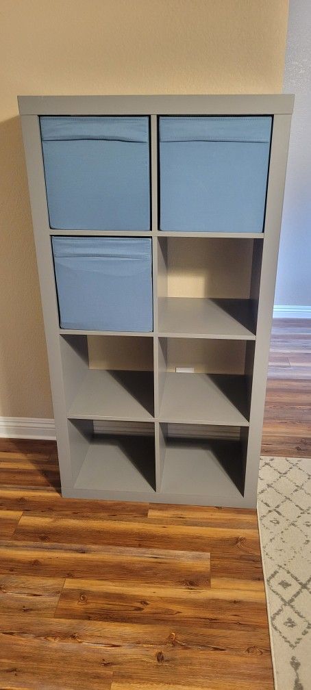 -Grey cube organizer -Fits 8 cubes -31x58x13 in -Includes 3 blue cubes shown -delivery for a fee