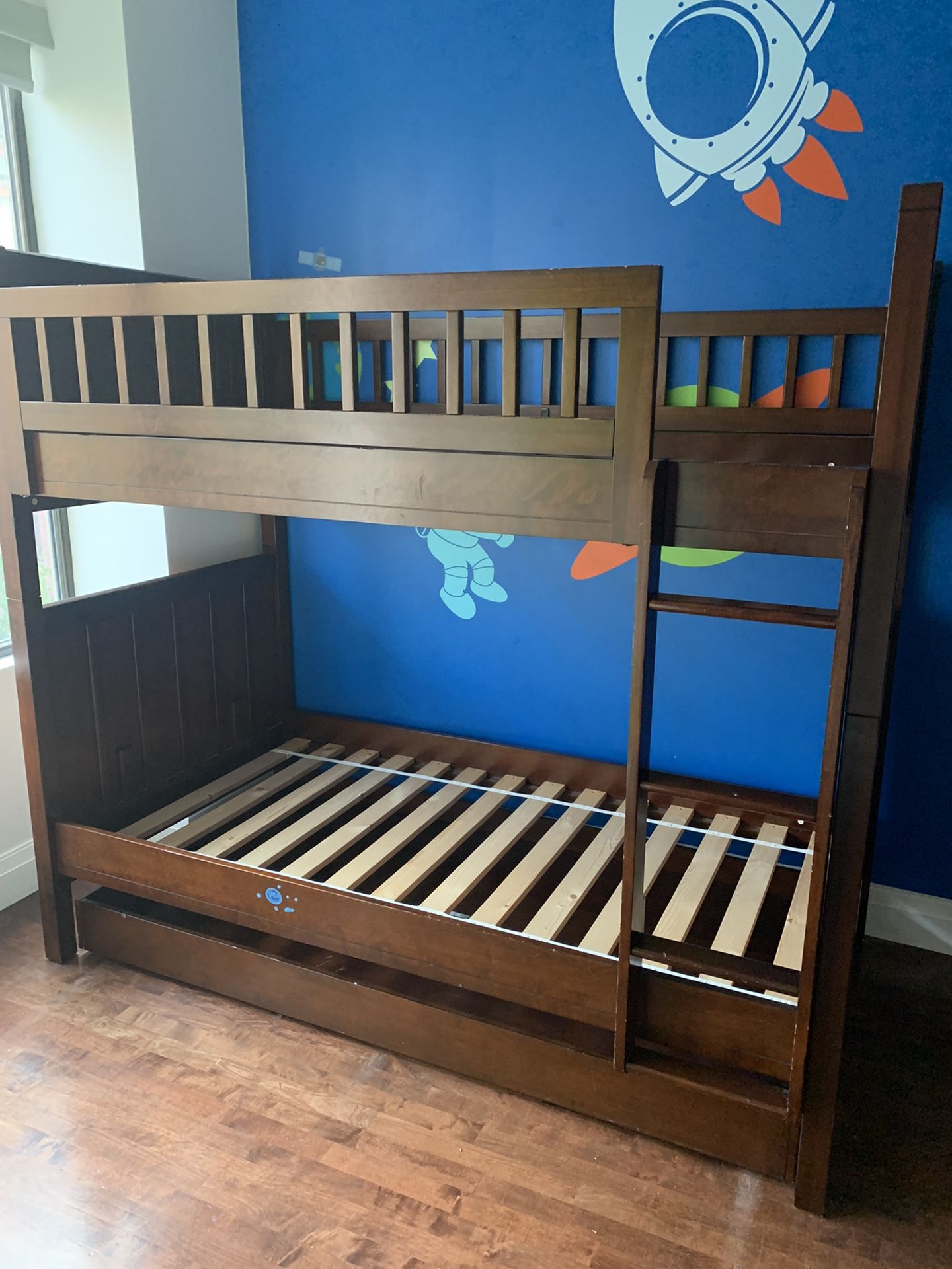 Twin over twin bunk bed. From Pottery Barn. Retails for $1799. Trundle bed included