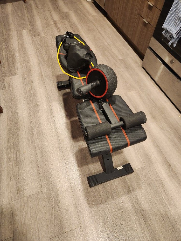 Attention: pickup as soon as possible, we are located in the AVA Capitol Hill. Versatile workout bench for home gym. Bench has multiple incline and decline positions. Great for full body workouts. Comes with an ab roller and set of resistance bands in bag. Not in picture, but there is also a pull-up bar to attach to doors. All in really good shape, barely used.