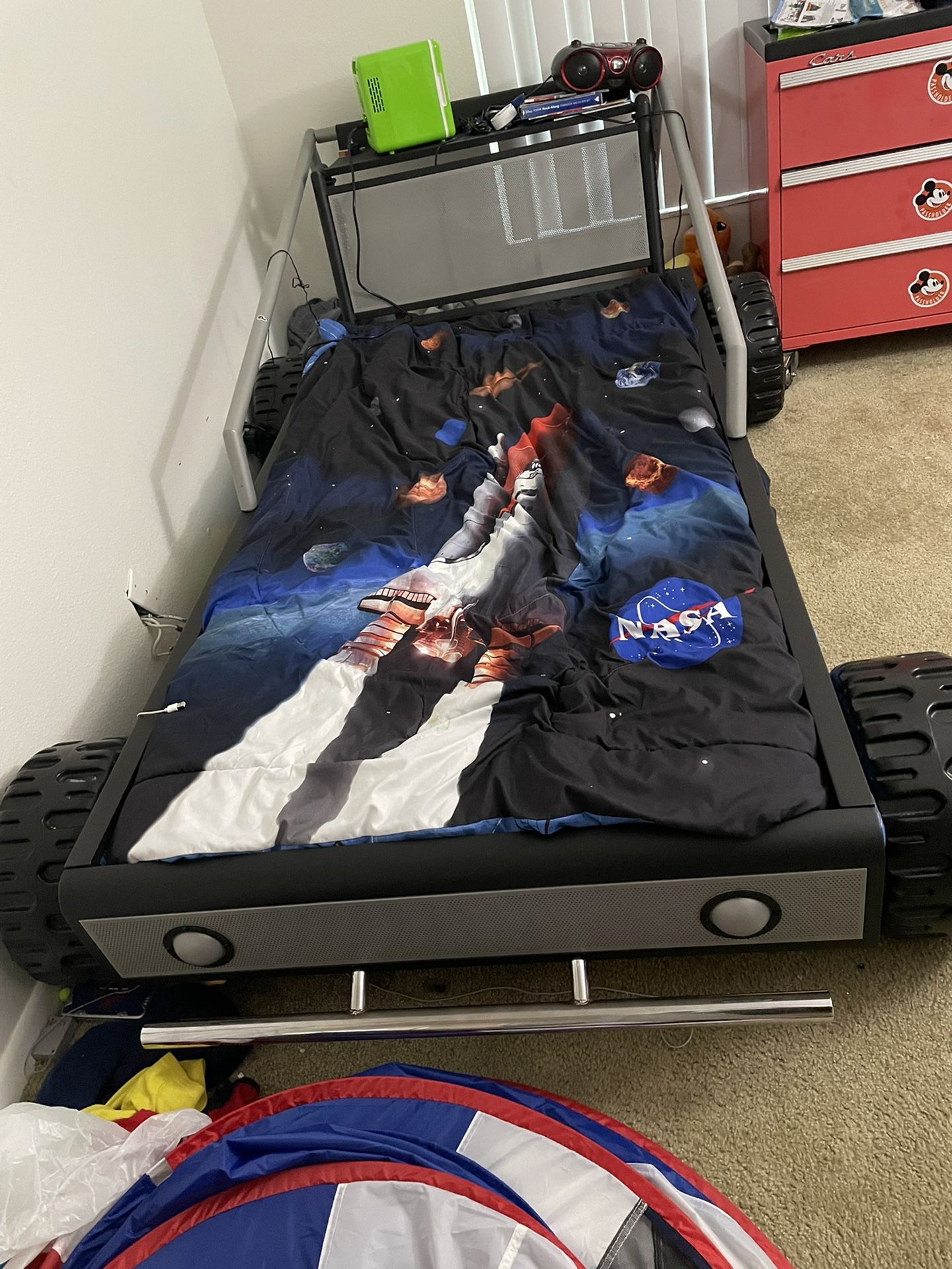 Twin “car” themed bed frame, “tool box” style desk and “tool box” style type dresser with mirror. Mattress NOT included. Cash at pick up only. Pick up only, on second floor. $200
