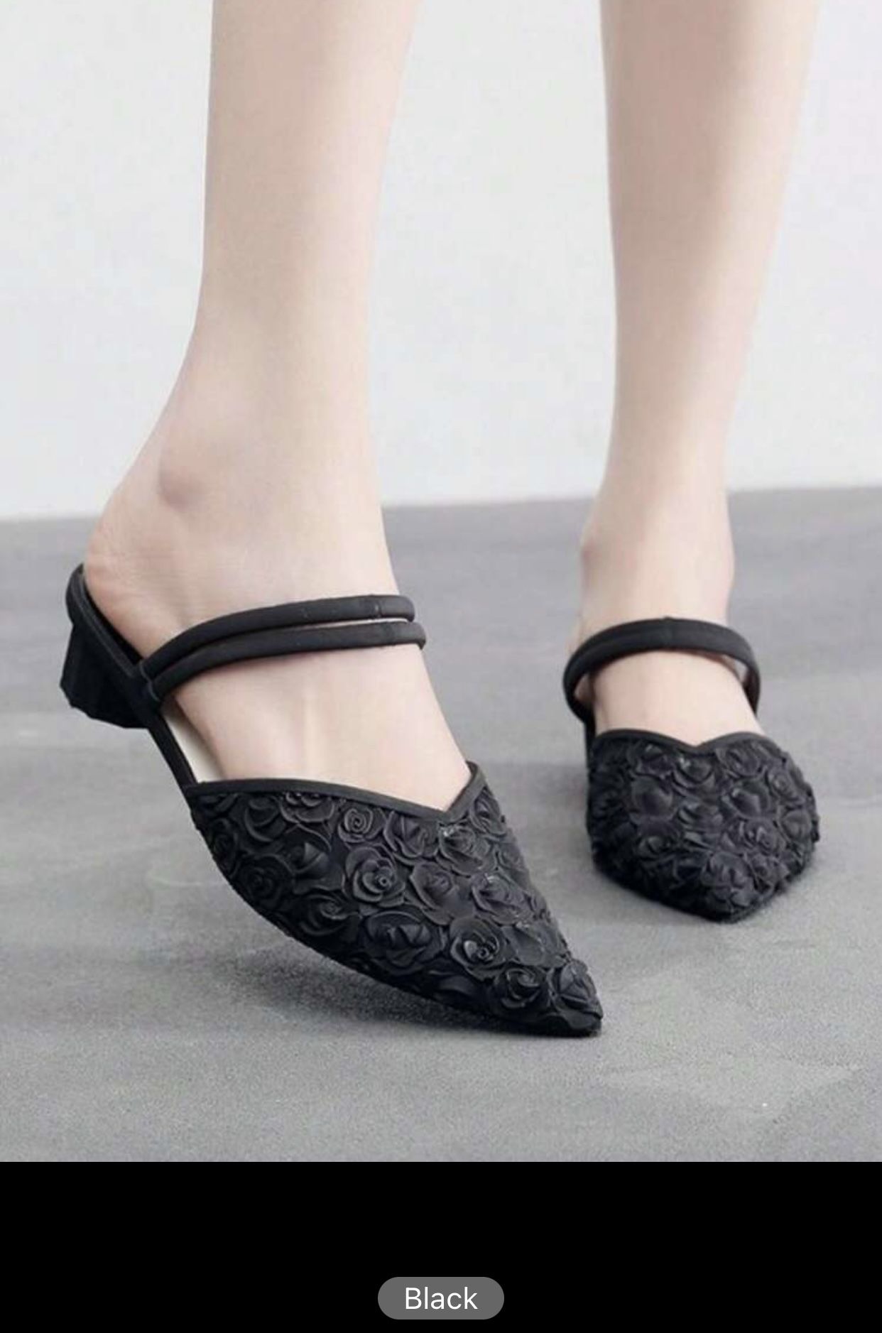 Women's High Heels, Casual Rose Design Semi-Slip Flat Pointed Toe Fashionable Black Elegant Style Waterproof Spring Summer Chunky Heels Women's Sandal