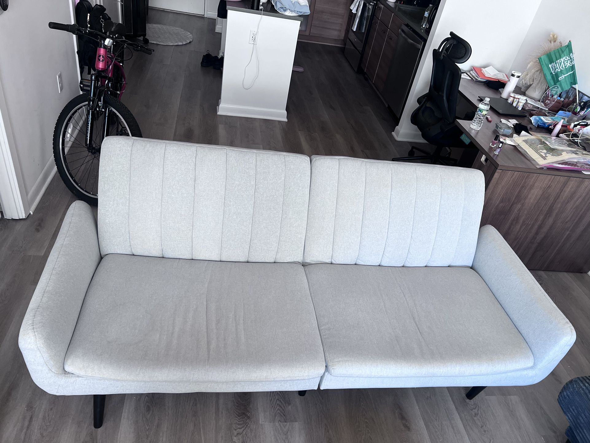 Modern gray convertible sofa bed with an adjustable split backrest and multiple positions. Lightly used for a very short time, in excellent condition like new. Comfortable, clean, and practical، perfect for a living room or guest space. Easy to transport, as it can be separated into two pieces and fits in any small car. No noticeable flaws.