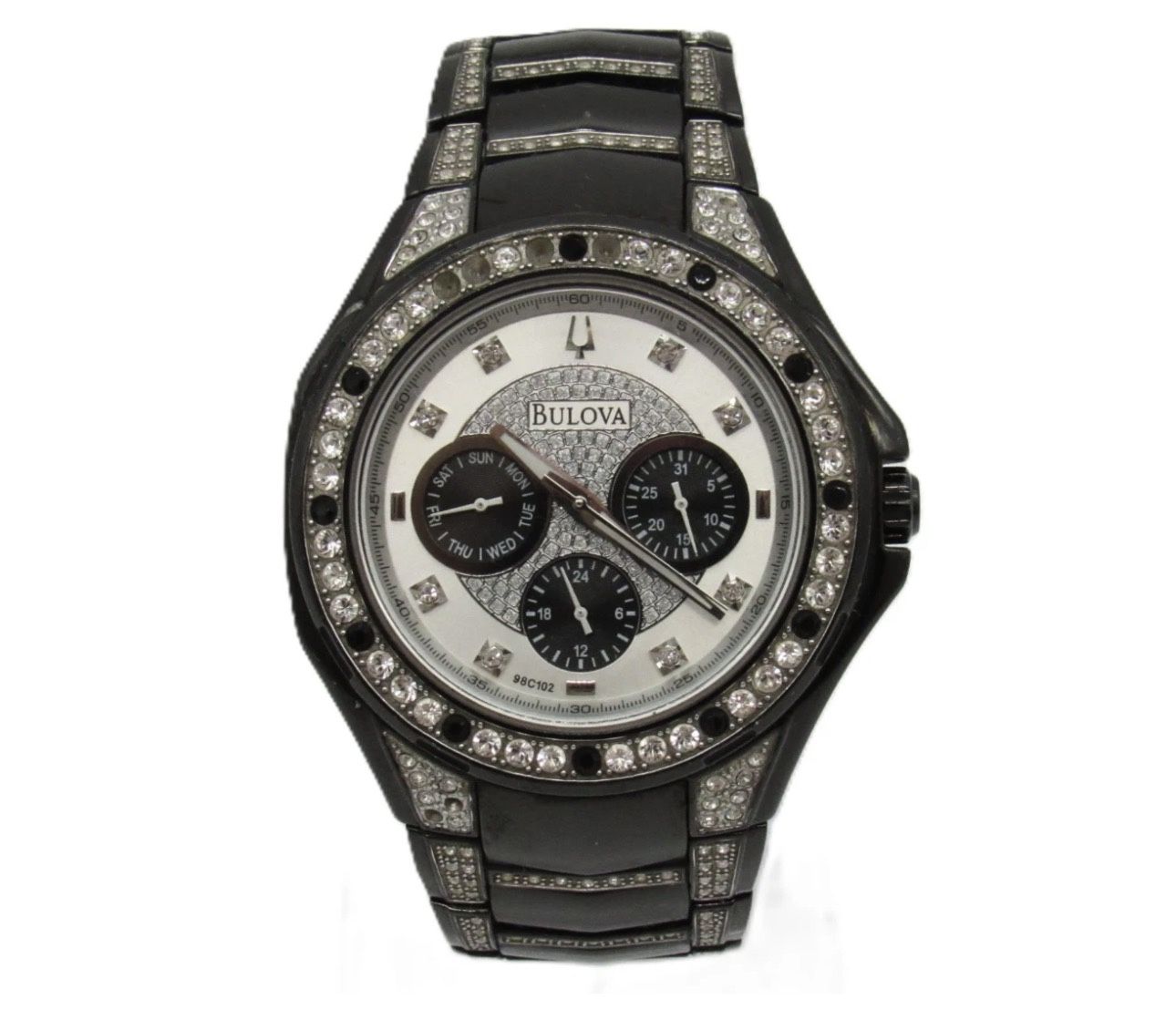 Stylish Bulova men's wristwatch featuring a black ion-plated stainless steel case and bracelet with crystal accents throughout. The watch has a silver-tone dial with crystal hour markers and three subdials displaying day, date, and 24-hour time. The bezel and bracelet are set with decorative crystals, giving the watch a bold, eye-catching look. Details: Brand: Bulova Model: 98C102 Movement: Quartz Functions: Day, Date, 24-Hour Subdial Case Material: Black Ion-Plated Stainless Steel Bracelet: Black IP with crystal accents Dial: Silver tone with crystal markers Size: Case diameter approx. 43 mm Fits approx. 6.5–7" wrist (additional links included) Condition: Pre-owned with visible wear including scratches and surface wear on case and bracelet. Some stones may show wear from use. Please see photos for exact condition. Includes extra links as shown.