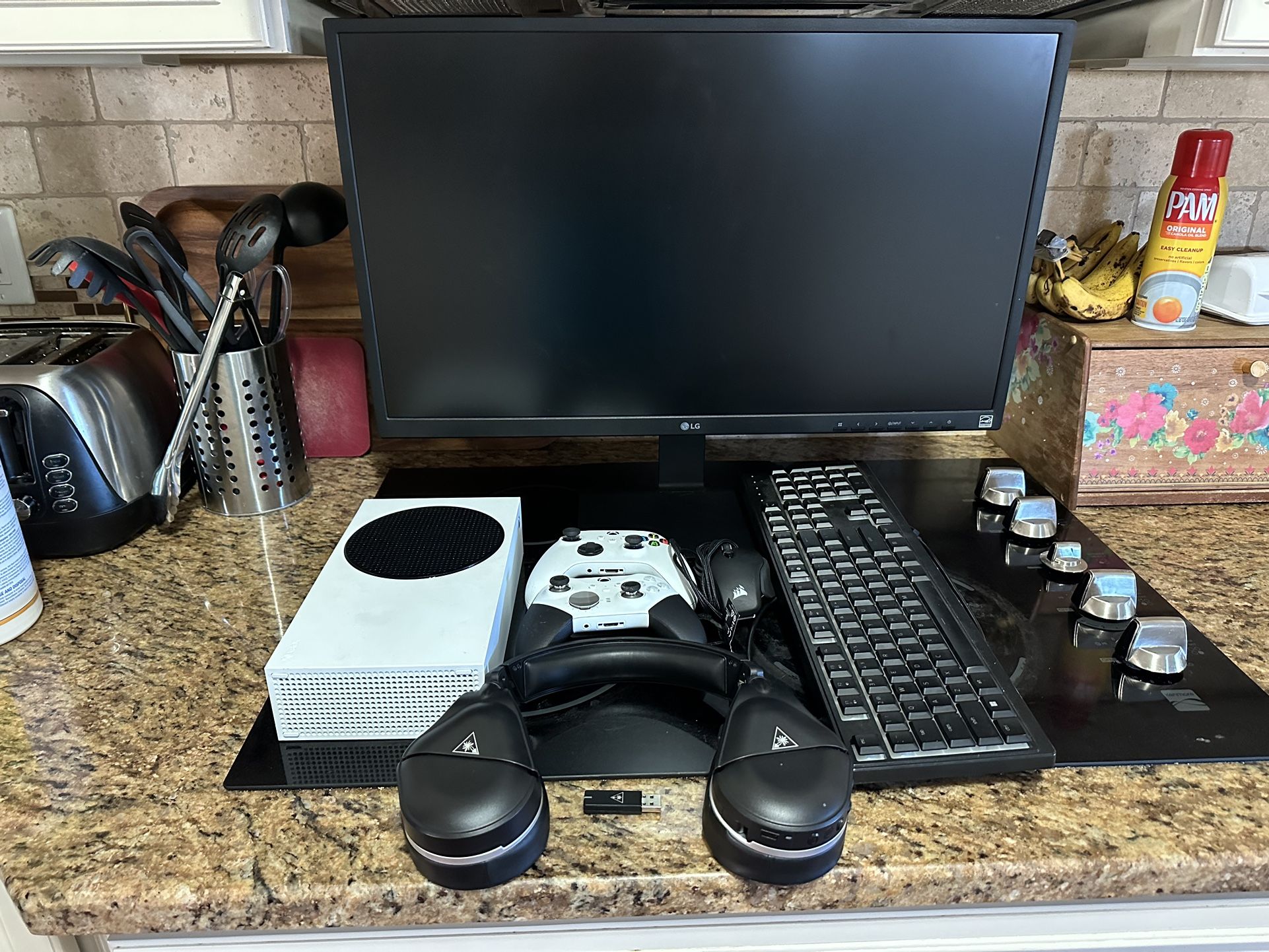 Comes with everything pictured. X Box Series X Headphones - Turtle Beach Stealth 700 X - Max - TX 27 inch LG monitor Mouse - Corsair Mouse Keyboard - Razer Ornata V3 X X box Series S controller (Regular) X box Elite Series 2 Controller (White) 3 games Dirt Rally The Incredibles Rayman Legends