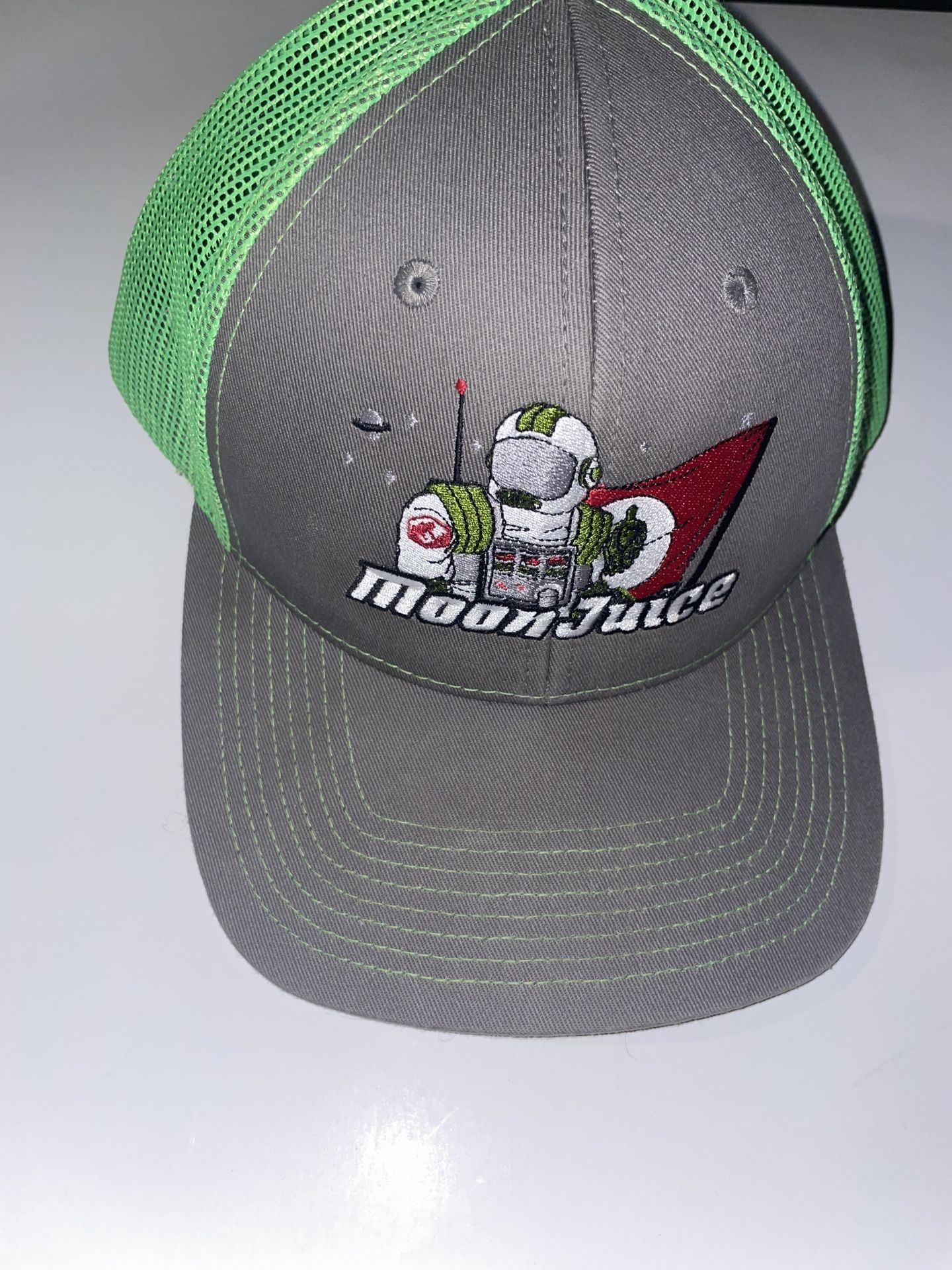 Stylish cap with Moon Juice logo. Features a gray front and green mesh back. Its in good clean condition. Its one size fits most with an adjustable back. It has breathable mesh and is trucker style.