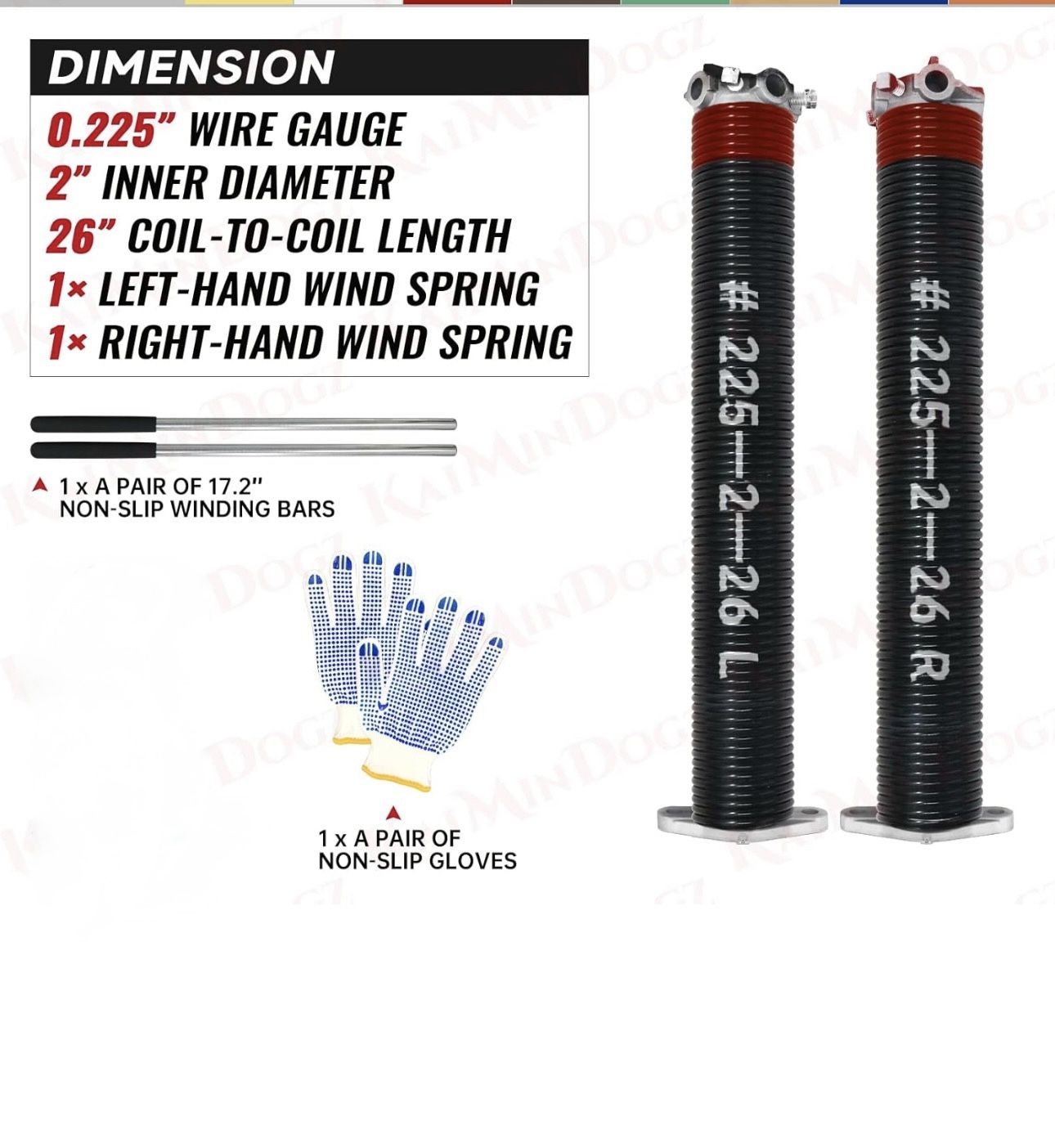 Pair of 2" Garage Door Torsion Springs Set with Non-Slip Winding Bars&Gloves, High Quality Precision Electrophoresis Oil-Free Black Coated for Replacement, MIN 16,000 Cycles (0.225x2''x26'')