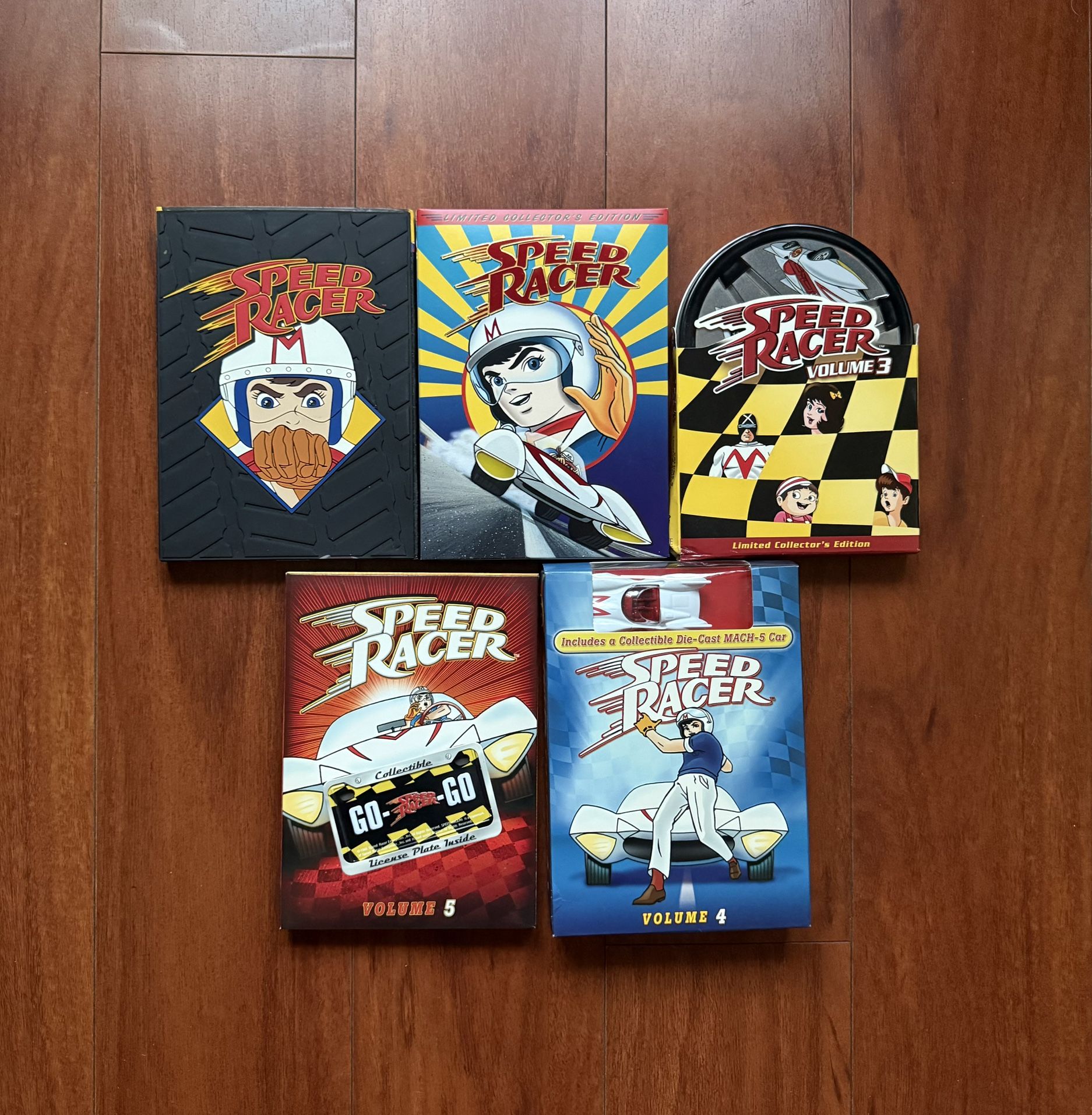 Speed Racer complete Volumes 1 - 5 DVD Sets Volume 1 - has rubber slip cover Volume 2 - musical slip cover that played the theme music of speed racer. Unfortunately that uses a battery and made I small mark on the inside slip cover. Volume 3 - wheel tin case. Unfortunately the bottom cardboard case is creased at one of the ends. Volume 4 - best extra of the set! Has the Mach 5 car! Never used. Volume 5 - mini license plate in slip cover. Open to offers. I also have other anime for sale in my listing. :)