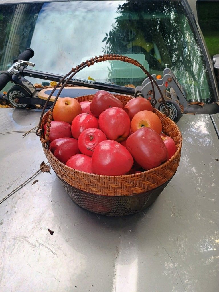 34 Various Fake Apples In A Metal & Woven Basket With 2 Handles, measures 15 inches by 12 inches by 6 inches, several different apple brands in total, great for fall decorations. Any questions or concerns message me..