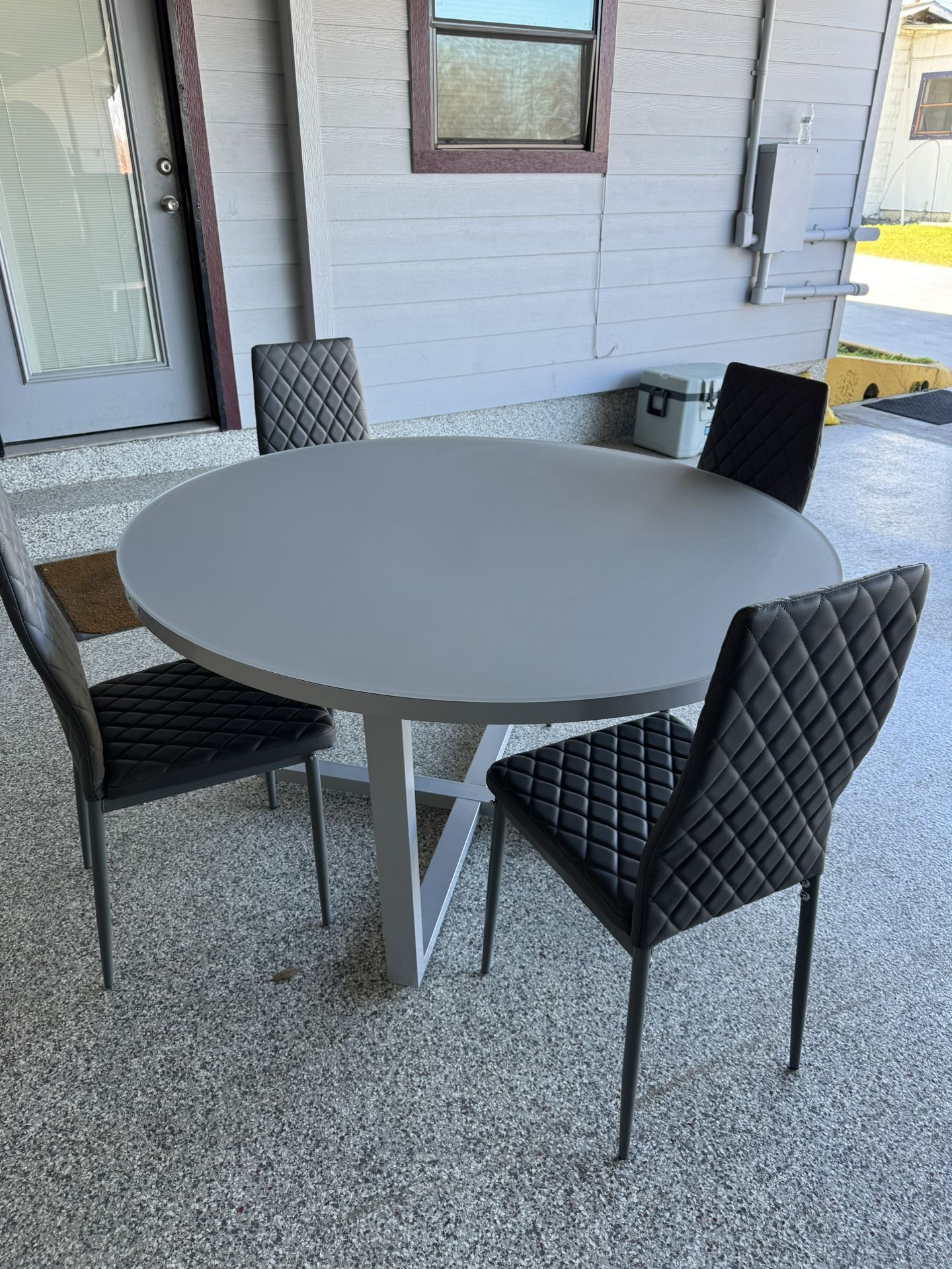 Brand new beautiful gray glass top indoor or outdoor table. Chairs included