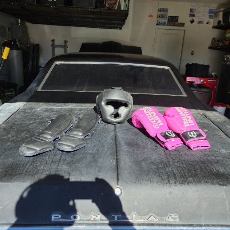 Boxing gear for sale. Mild wear-and-tear. $30 OBO. Head gear size: Small Gloves: 16oz Shin guards: Small