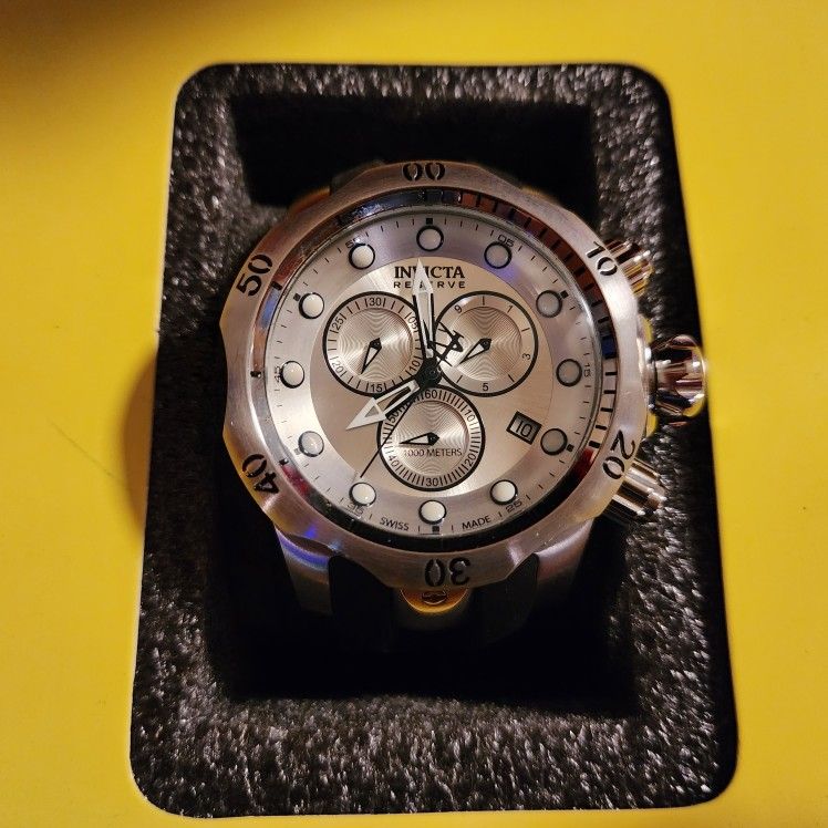 Beautiful Invicta Venom Reserve Divers watch. Model 6116. This watch is very large at 53.7mm. Swiss movement, waterproof to 1000 meters. *NEVER WORN*. INCLUDES WATERTIGHT WATCH DIVERS CASE THAT HOLDS 3 WATCHES. Cash and carry. NO ELECTRONIC PAYMENTS OF ANY KIND. Model 6116 Specs Case and Dial Case Size: 53.7mm Case Material: Stainless Steel Bezel Material: Stainless Steel Bezel Color: Steel Crown Type: Screw Down Crystal Type: Flame Fusion Dial Material: Metal Movement Components: Swiss Caliber: G10.211 Function Type: Quartz Water Resistance Water Resistance: 1000m Band Material: Stainless Steel, Polyurethane Tone: Steel, Black Length: 210mm Size: 26mm