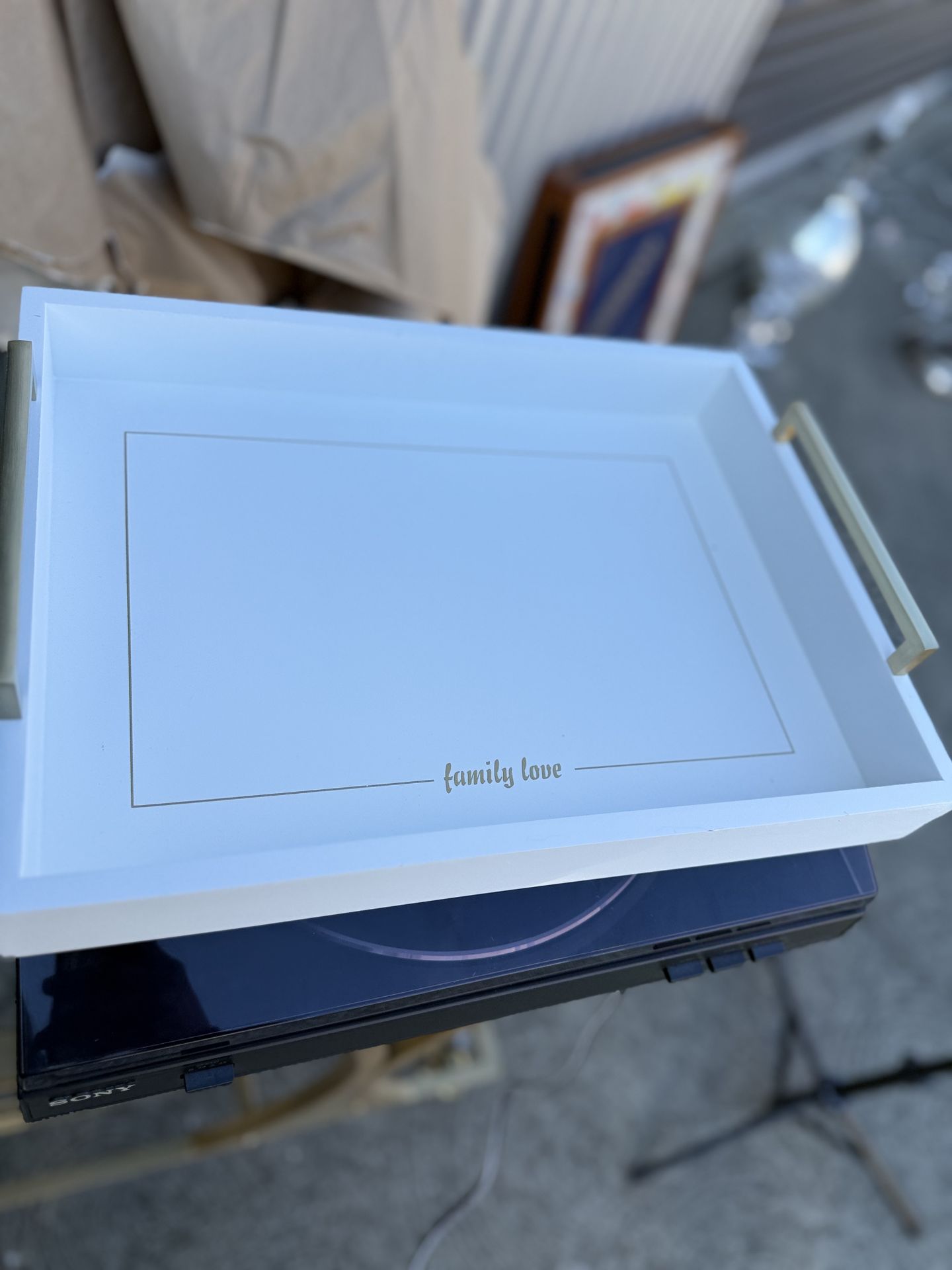 Beautiful white decorative serving tray featuring gold side handles and subtle gold trim detail with “family love” printed inside. • White finish with gold accents • Gold metal handles • “family love” scripted detail • Lightweight but sturdy • Great condition Perfect for: • Coffee table styling • Ottoman décor • Kitchen counter display • Guest room • Housewarming gift Can be used for serving drinks, displaying candles, perfumes, books, or seasonal décor. Neutral and elegant — fits modern, farmhouse, glam, or transitional spaces. 📍 Located in Concord