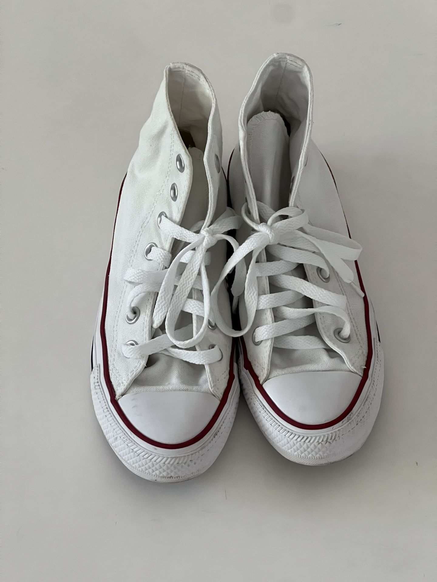 Brand : Converse Color: White US Shoe Size: 6 Type: Athletic Department: Unisex Adults Style: Sneakers Shoe Shaft Style: High Top Model: Converse Chuck Taylor All Star High Theme: Stars Closure: Lace Up Outsole Material: Rubber Occasion: Activewear, Casual, Workwear Season: Fall, Spring, Summer, Winter Features: Comfort, Lightweight Used one time, almost new. Complete clean before post. Smoke and Pet free home. Look the pictures for details. Hablo español.