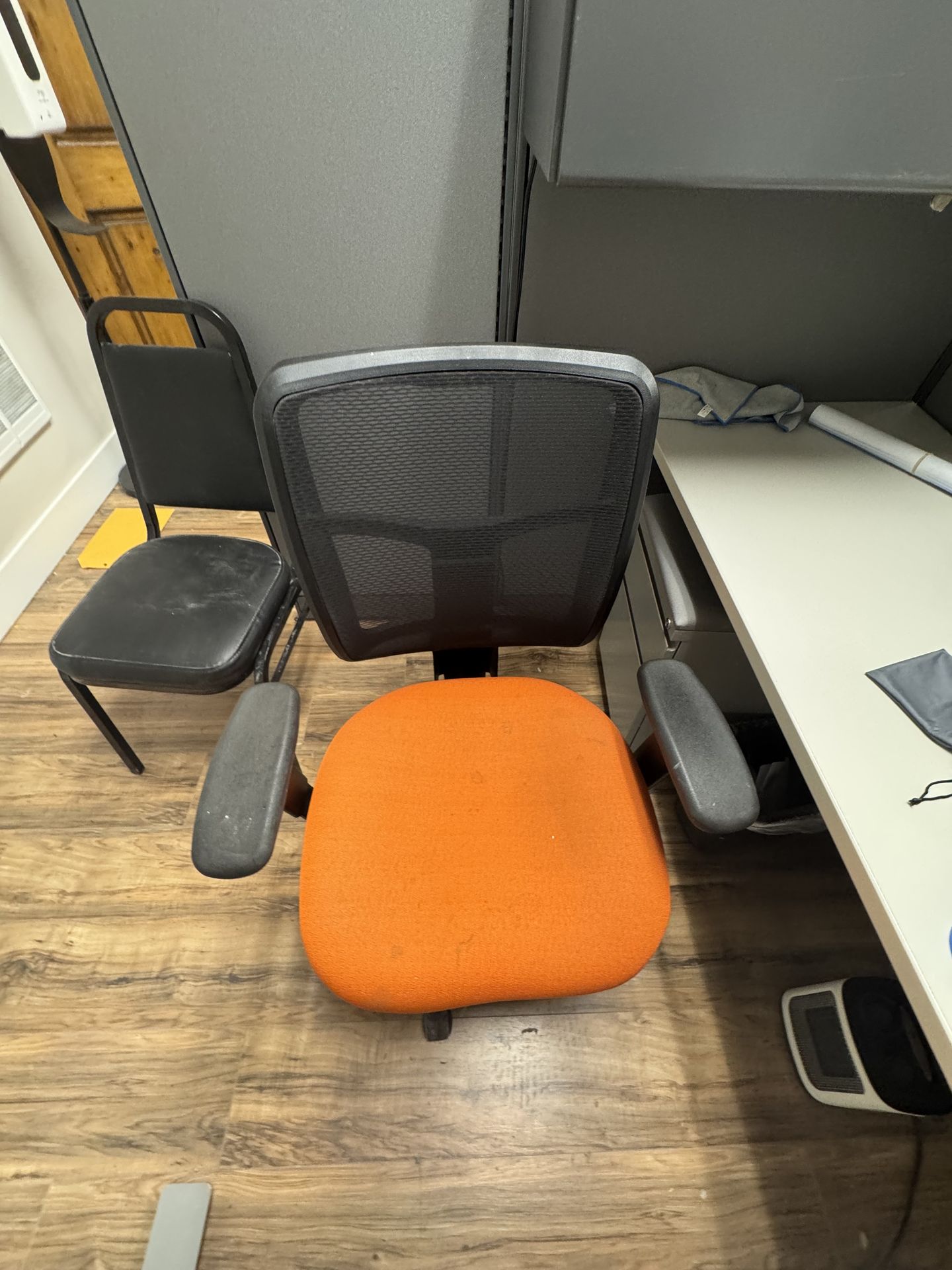 We are selling 3 complete office cubicle workstations, each including desks and ergonomic office chairs. Great setup for a small business, startup, or home office expansion. ✔ Available as full sets ✔ Open to selling individual pieces ✔ Used but in good working condition ⸻ 🔹 Each Cubicle Includes: • L-shaped desk surface • Sturdy metal desk legs/frame • Privacy panel walls (gray fabric finish) • Overhead storage cabinet • Lower 2-drawer filing cabinet • Electric sit/stand desk controls (on select desks – see photos) • Ergonomic office chair with mesh back • Some units include adjustable headrest ⸻ 🪑 Chairs • Comfortable cushioned seat (orange and black options) • Mesh back support • Adjustable armrests • Rolling base • Good condition, normal wear from office use ⸻ 📁 Storage • Overhead cabinet attached to cubicle • 2-drawer filing cabinet (dark wood finish) • Great for documents, supplies, and personal items ⸻ 📏 Approximate Size (Per Cubicle) • Standard office cubicle footprint • L-shaped desk design • Ideal for maximizing corner space • High panels for privacy and noise reduction ⸻ 💼 Perfect For: • Construction or trade office • Small business teams • Accounting or administrative workspace • Real estate offices • Home office setup • Shared workspaces ⸻ Condition Used in office environment. Some cosmetic wear consistent with normal use (minor marks). All desks and chairs are structurally solid. ⸻ 💰 Pricing • • Discount available if buying all 3 sets • Willing to sell: • Chairs only • Desks only • Cabinets only • Full cubicle setups ⸻ 🚚 Pickup Buyer responsible for pickup. Bring proper transportation and help for loading. MO
