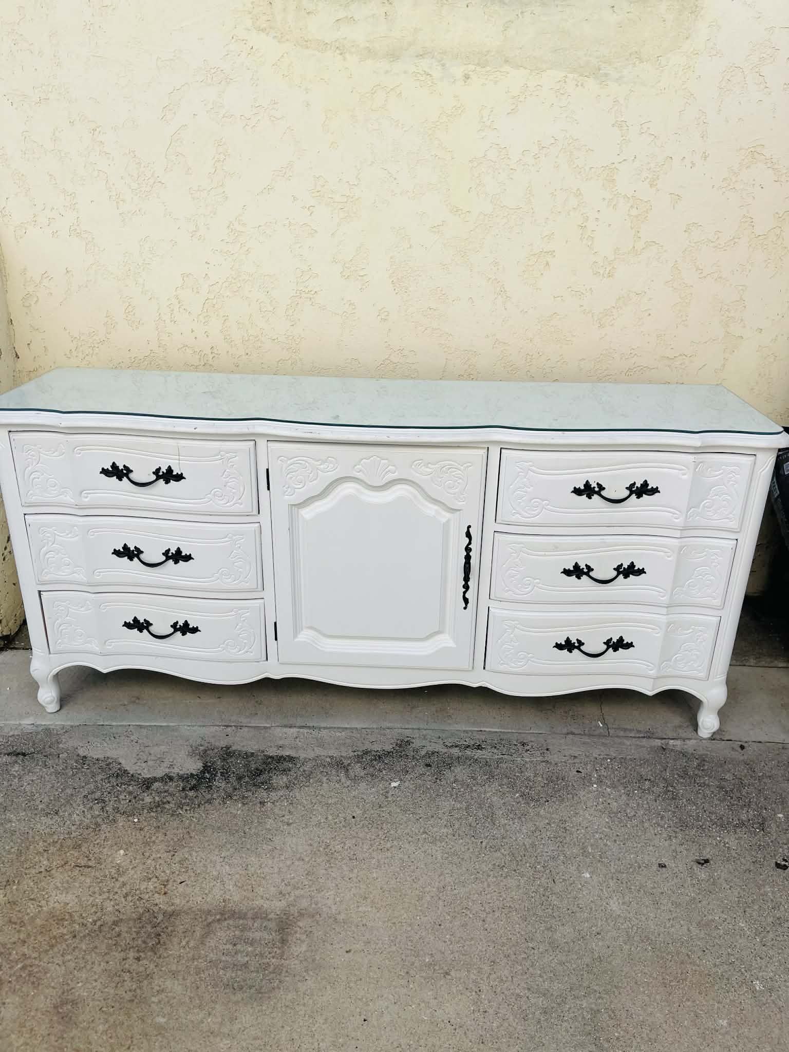 Had custom GLASS to protect dresser. Dimensions: 32Hx 18W x 69L