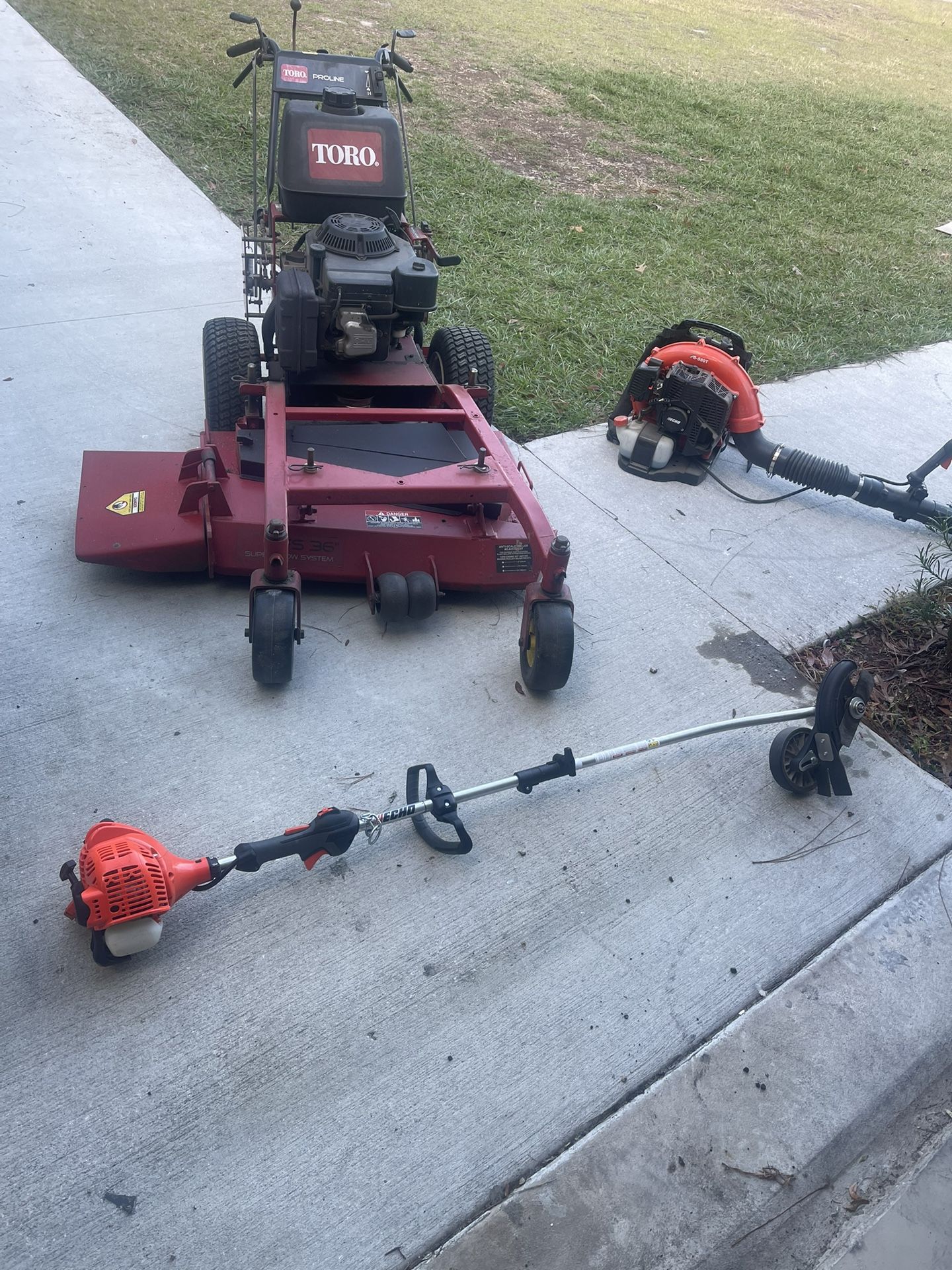 Everything runs! Lawnmower on different post. Echo blower Echo edger with attachments Everything $3000obo Make offer on each item if need separate